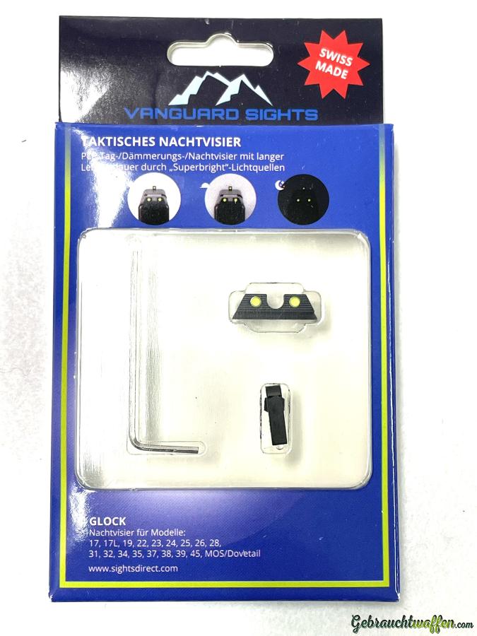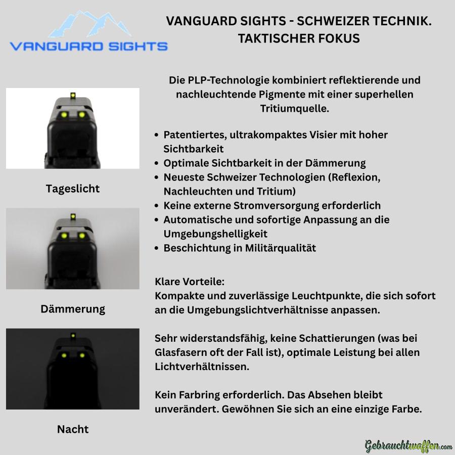 Vanguard-Visiere werden vom führenden Schweizer OEM-Hersteller von GTLS-Tritiumkapseln, smolsys AG, gefertigt. Keine Glasfaser, kein Farbring erforderlich – ein einziges Absehen, Tag und Nacht, unabhängig von den Lichtverhältnissen. Eine Farbe, eine Form, eine Größe. Erleben Sie die schnellste Zielerfassung aller Zeiten. Die „Superbright“-Kapseln bieten drei Jahre längere Lebensdauer und sind dank eines zum Patent angemeldeten, dichteren Befüllungsverfahrens mit Tritiumgas 30 % heller. Vanguard-Visiere. Fortschrittliche Nachtsichtgeräte für Profis. U-förmige Kimme. Geeignet für Glock Modelle 17, 17L, 19, 22, 24, 25, 26, 28, 31, 32, 34, 35, 37, 38, 39, 45, and 43X & 48
