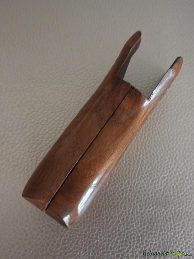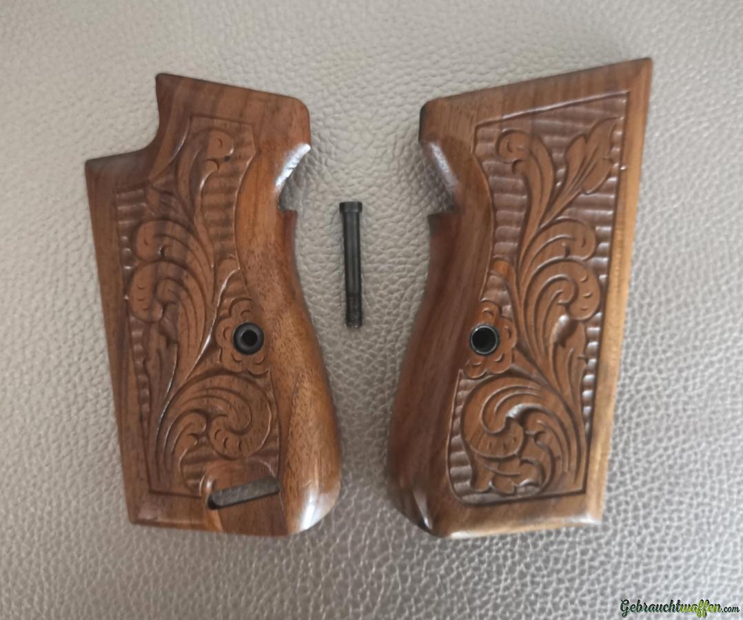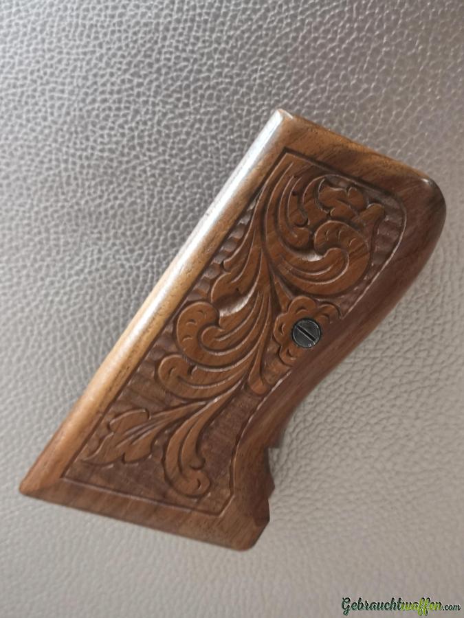 Sehr schöne, aufwendig von Hand geschnitzte und passgenaue Griffschalen aus Nussbaum für eine Luxus-Variante.