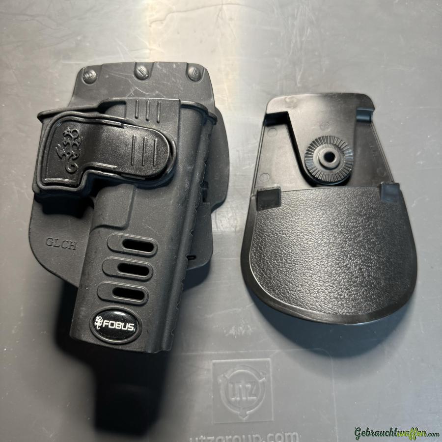 Zum Verkauf stehen ein Fobus Glock 17 Paddle-Holster und eine BH Vario-Gürtelhalterung, die für verschiedene Gürtelbreiten geeignet ist.