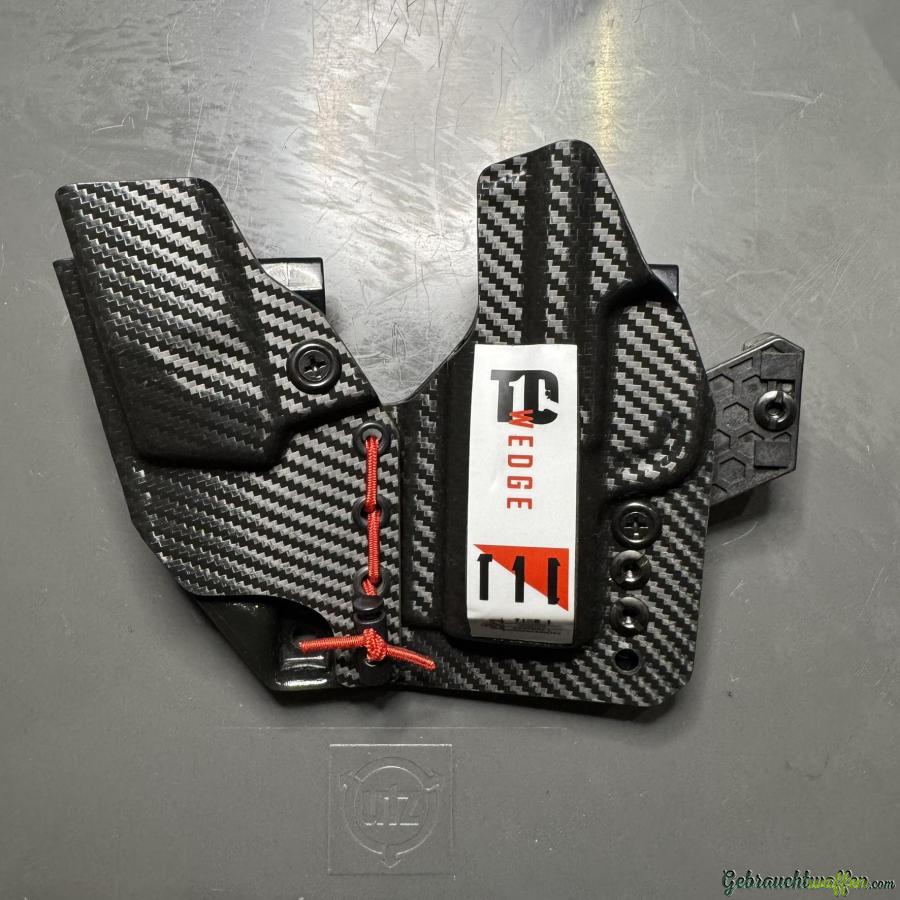 Zum Verkauf steht ein IWB-Holster (Modell Axis Elite) für eine P365-Pistole und ein Ersatzmagazin von Tier 1 Concealed (T1C), inklusive Wedge Kit. Farbe: Carbon Black, rote Gummikordel.