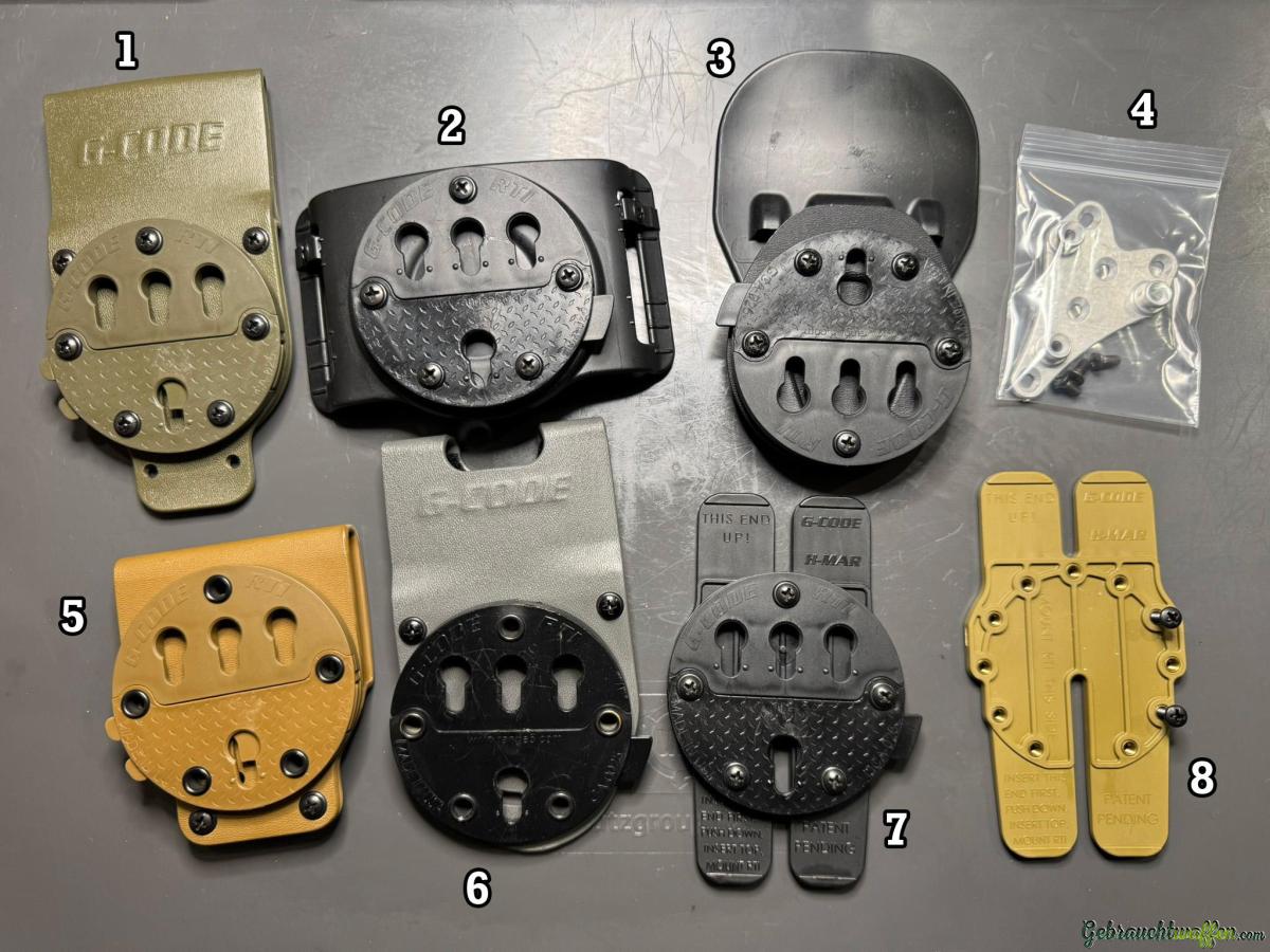 Zum Verkauf stehen verschiedene G-Code-Halterungen und Adapter. Das Bild ist beschriftet, dies sind die Artikel: