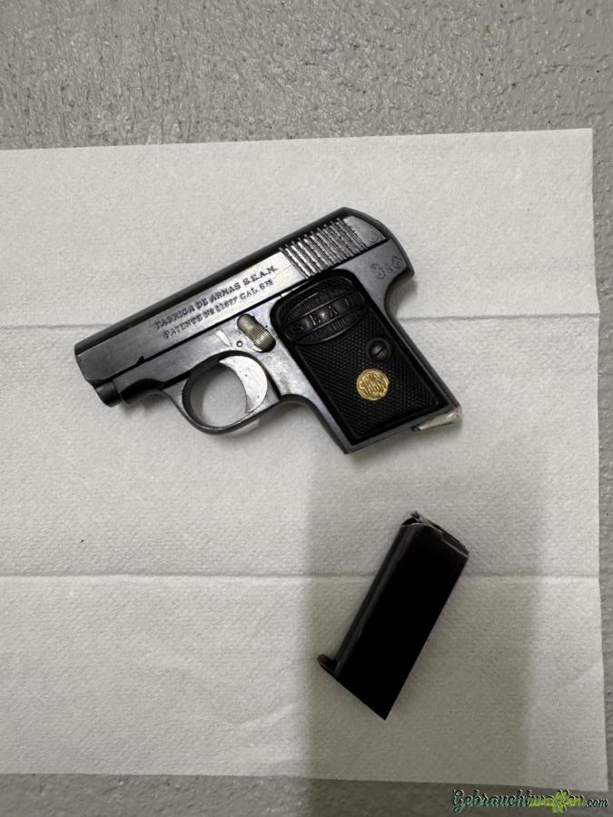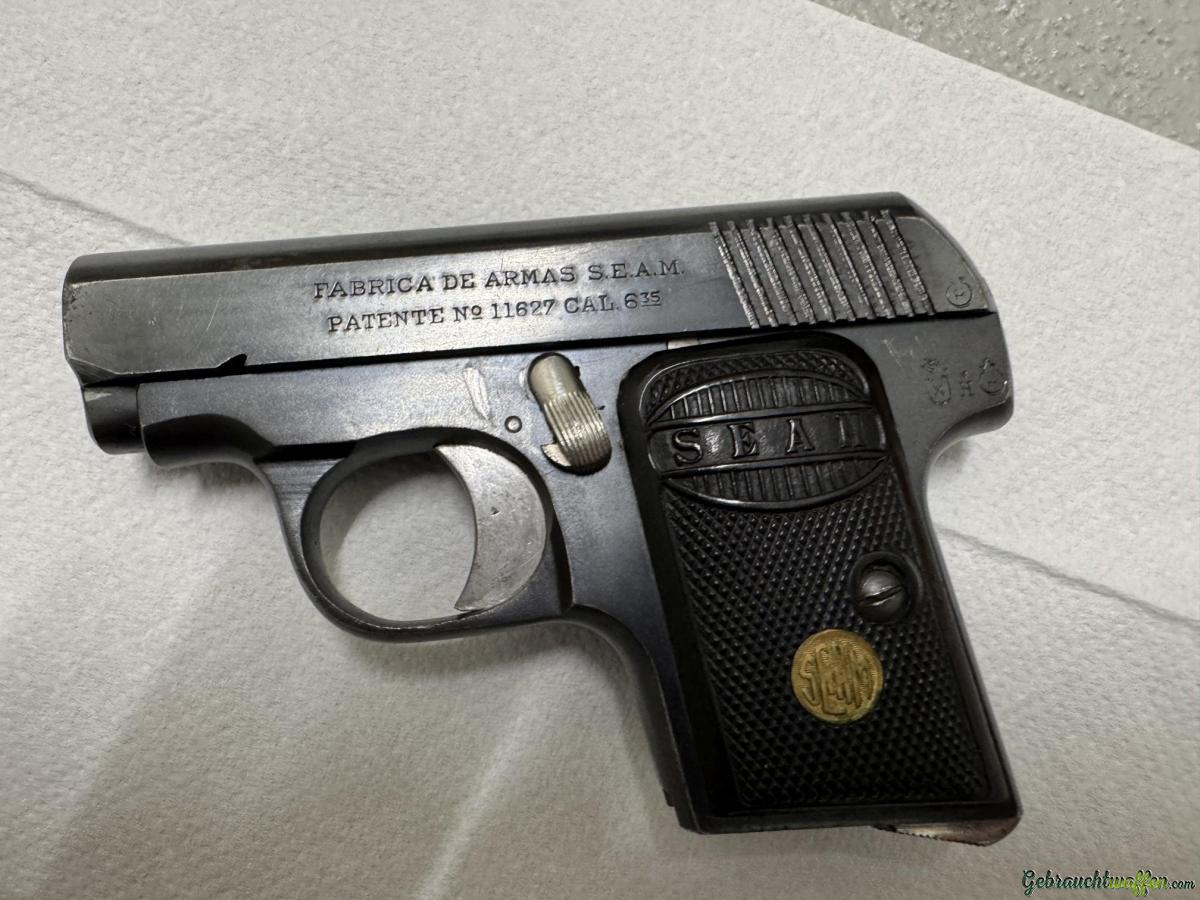 Hergestellt von Fabrica de Armas S.E.A.M. (Sociedad Española de Armas y Municiones) aus Eibar/Spanien. Die Firma hatte (unter unterschiedlichen Namen) Bestand zwischen 1909 bis 1967 - aufgrund der Nutzungsspuren der Waffe und des Names des Herstellers schätze ich das Baujahr auf die 1930er.