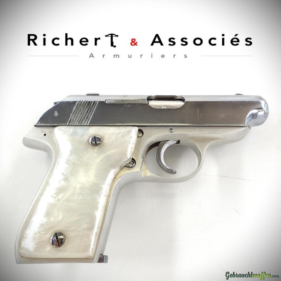 Pistolet Basque mod. 380, cal. .380acp (9mm Kurz), finition chromée polie, en bon état, livré avec sa boîte d'origine.