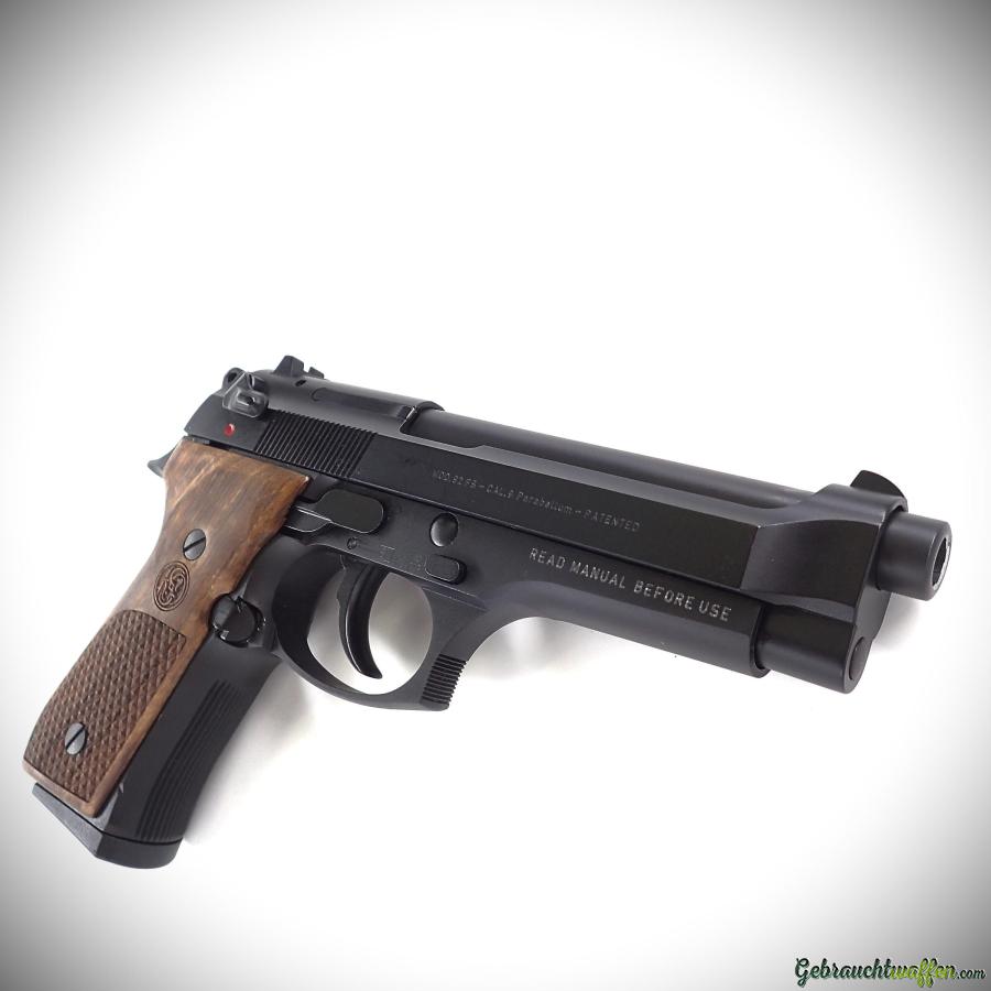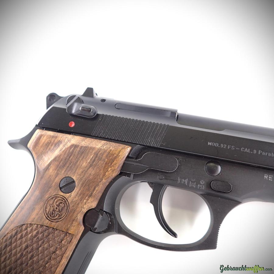 Beretta Pistole Modell 92FS, Kaliber 9 mm P, 15-Schuss-Magazin, 5-Zoll-Lauf, DA/SA-Abzug, feste Visierung, KSD-Holzgriffschalen (zusätzlich originale Kunststoffgriffschalen), Baujahr 1999 (Code BM), sehr guter Zustand, inklusive Originalverpackung und einem zweiten Originalmagazin.