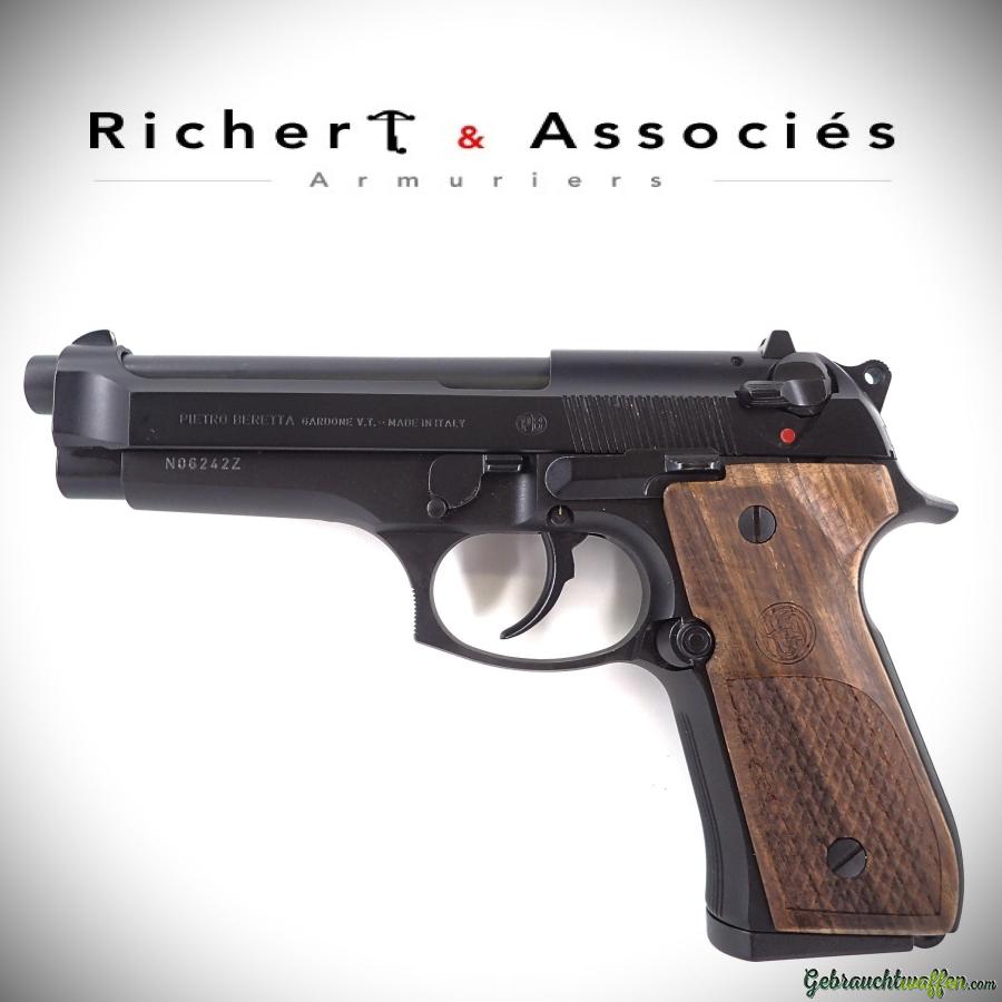 Pistolet Beretta mod. 92FS, cal. 9mmP, chargeur 15 coups, canon de 5 pouces, détente DA/SA, hausse et guidon fixes, plaquettes KSD en bois (+ plaquettes en plastique d'origine), fabriqué en 1999 (code BM), en très bon état, livré avec sa boîte et 2ème chargeur d'origine.