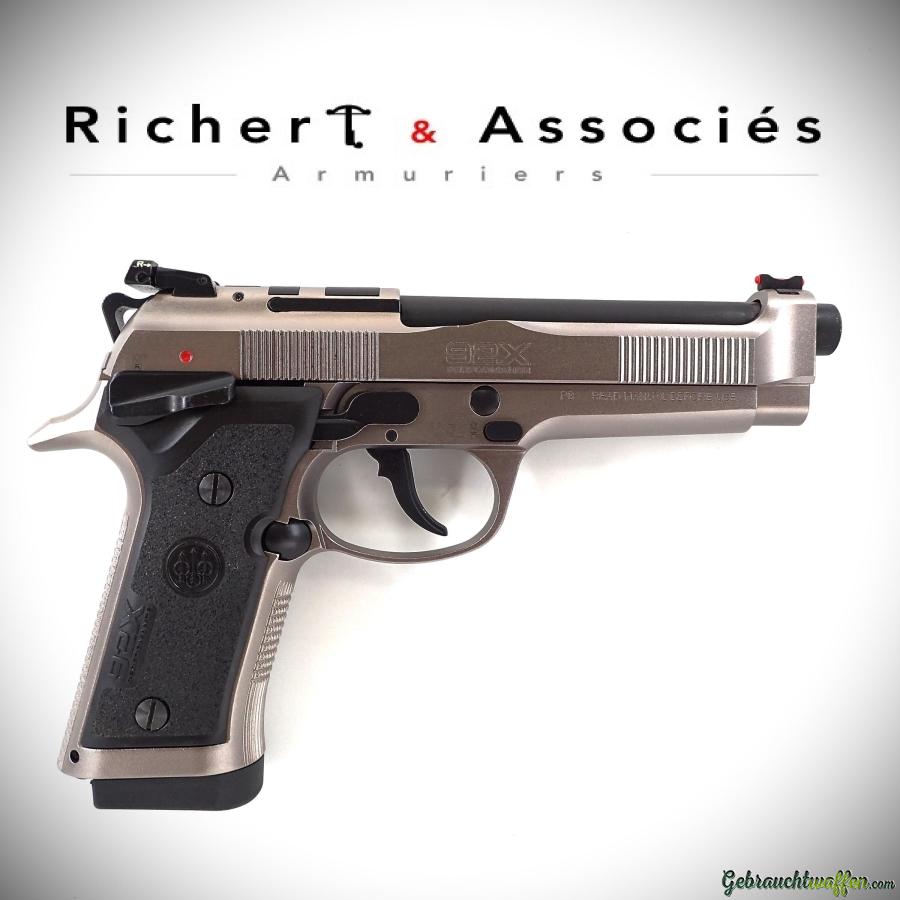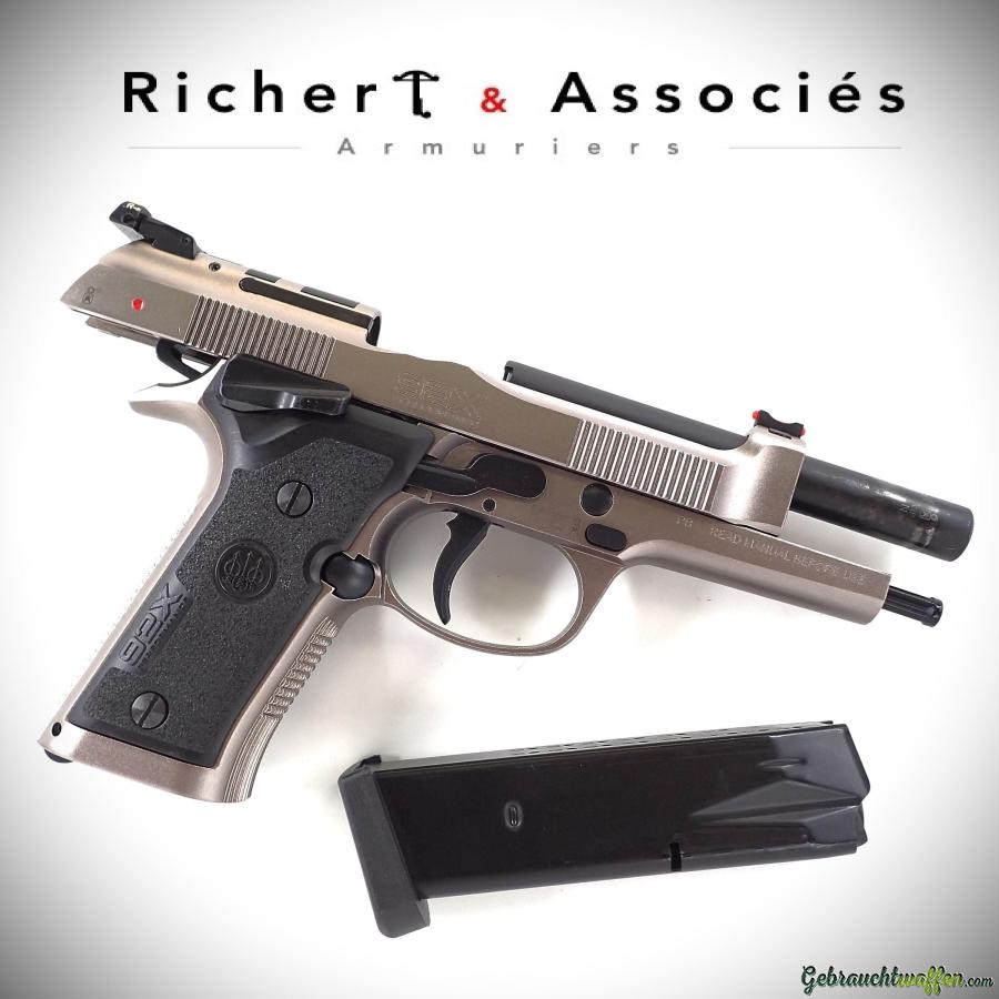 Beretta Modell 92X Performance Pistole, Kaliber 9 mmP, Ganzstahlversion der Basis-Beretta 92, mit verstellbarer Kimme und Fiberglaskorn, verbessertem Abzugssystem und leichterem Hahn, größerem und besser zugänglichem beidseitigen Sicherungshebel am Rahmen, zwei Paar Kunststoffgriffen, Baujahr 2021, in ausgezeichnetem Zustand, mit Originalverpackung, Handbüchern und zweitem Originalmagazin.