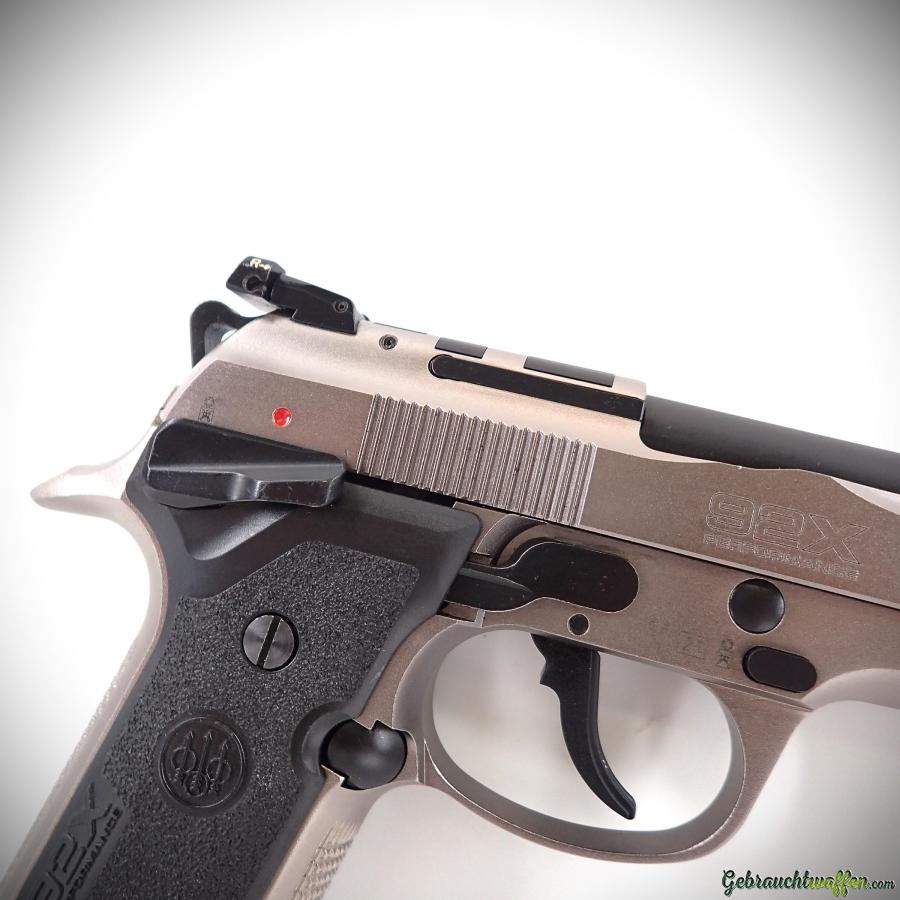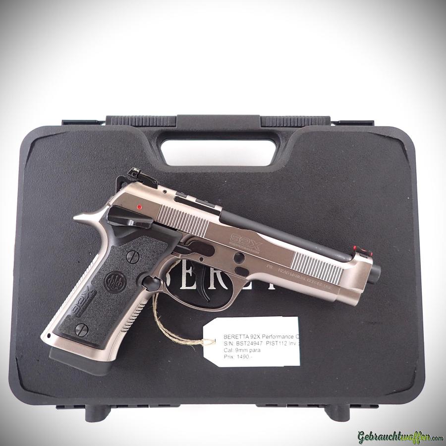 Pistolet Beretta modèle 92X Performance, cal. 9mmP, version tout acier du Beretta 92 de base, avec une hausse réglable et guidon en fibre, système de détente amélioré et marteau allégé, levier de sécurité sur la carcasse ambidextre plus grand et accessible, deux paires de plaquettes en plastique, fabriqué en 2021, en excellent état, livré avec sa boîte, manuels et 2ème chargeur d'origine.