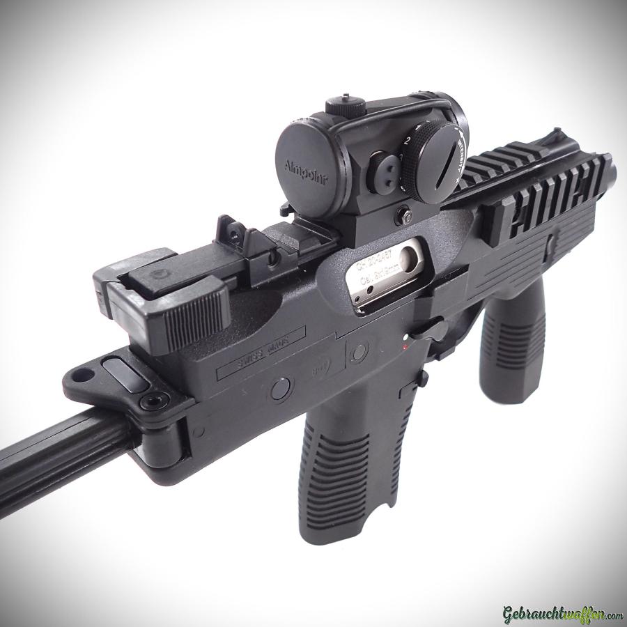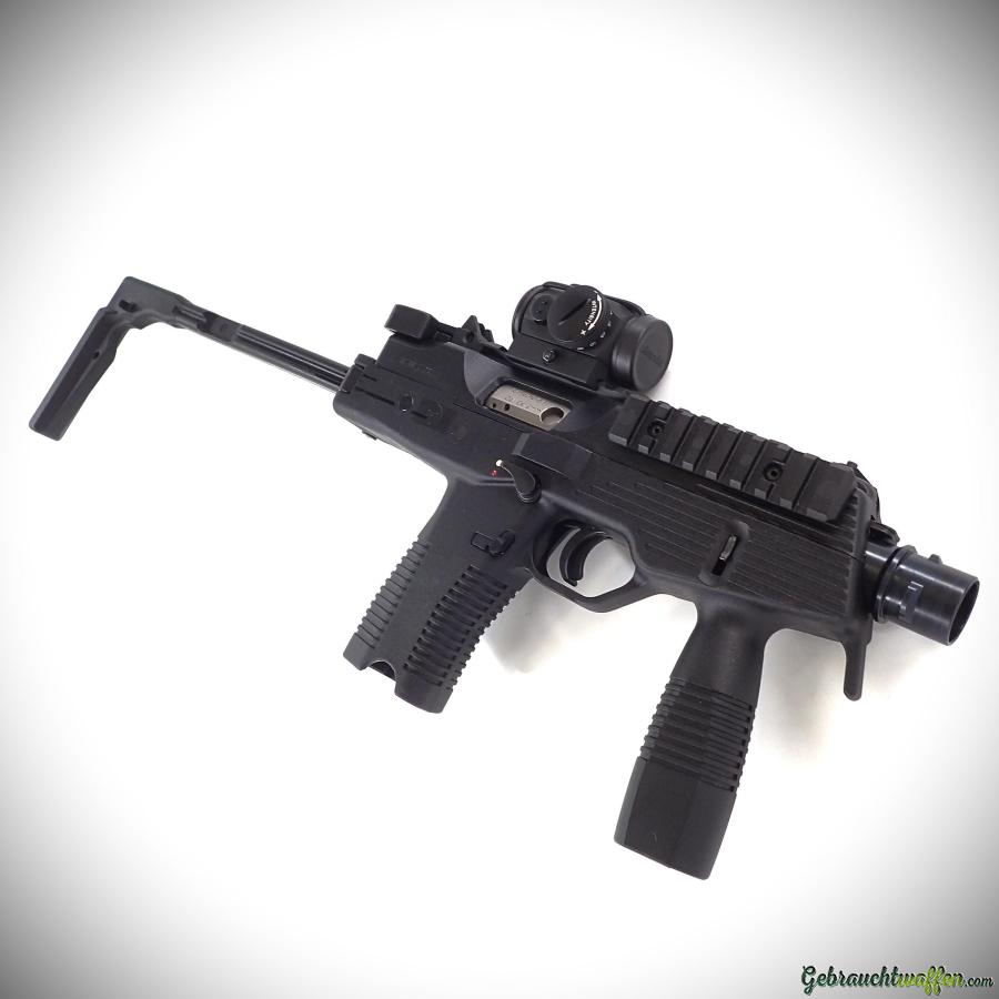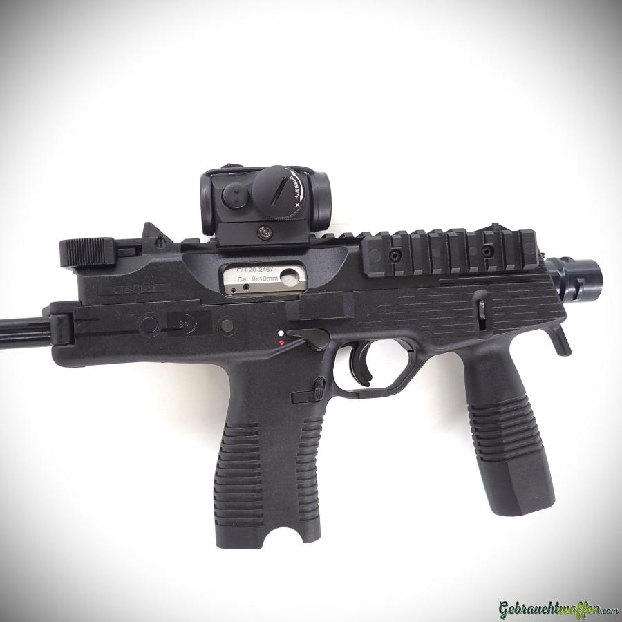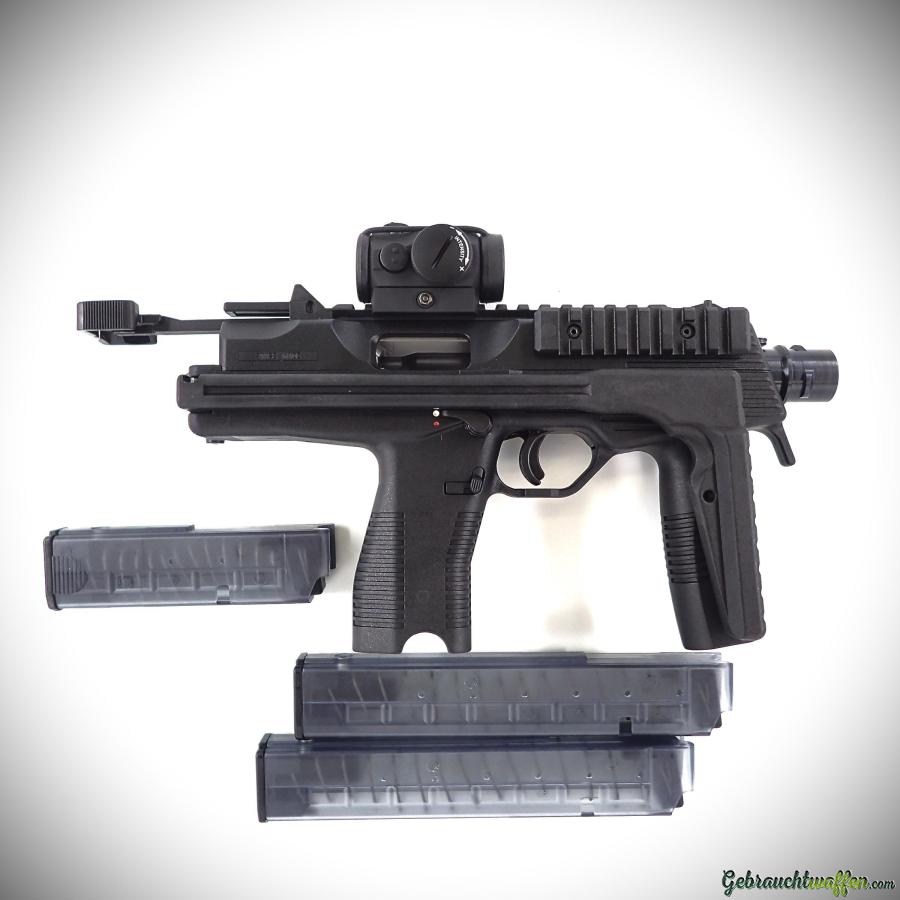 B&T pistol mod. TP9, cal. 9mmP, with folding stock, equipped with Aimpoint red dot, new second-hand, never fired, delivered with box, accessories, manual and 3 magazines (1x 20-shot, 2 x 30-shot).