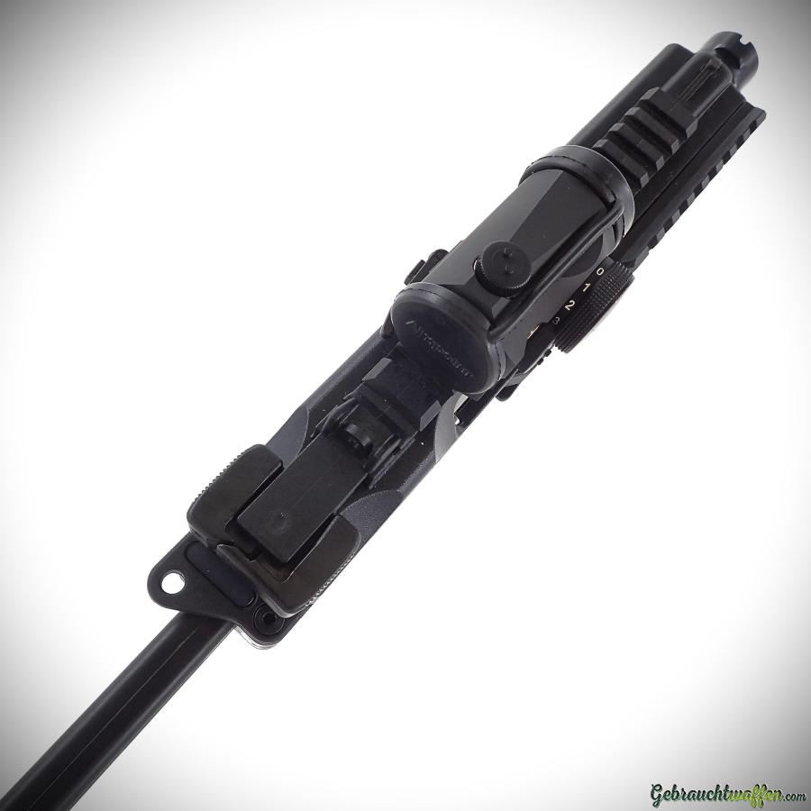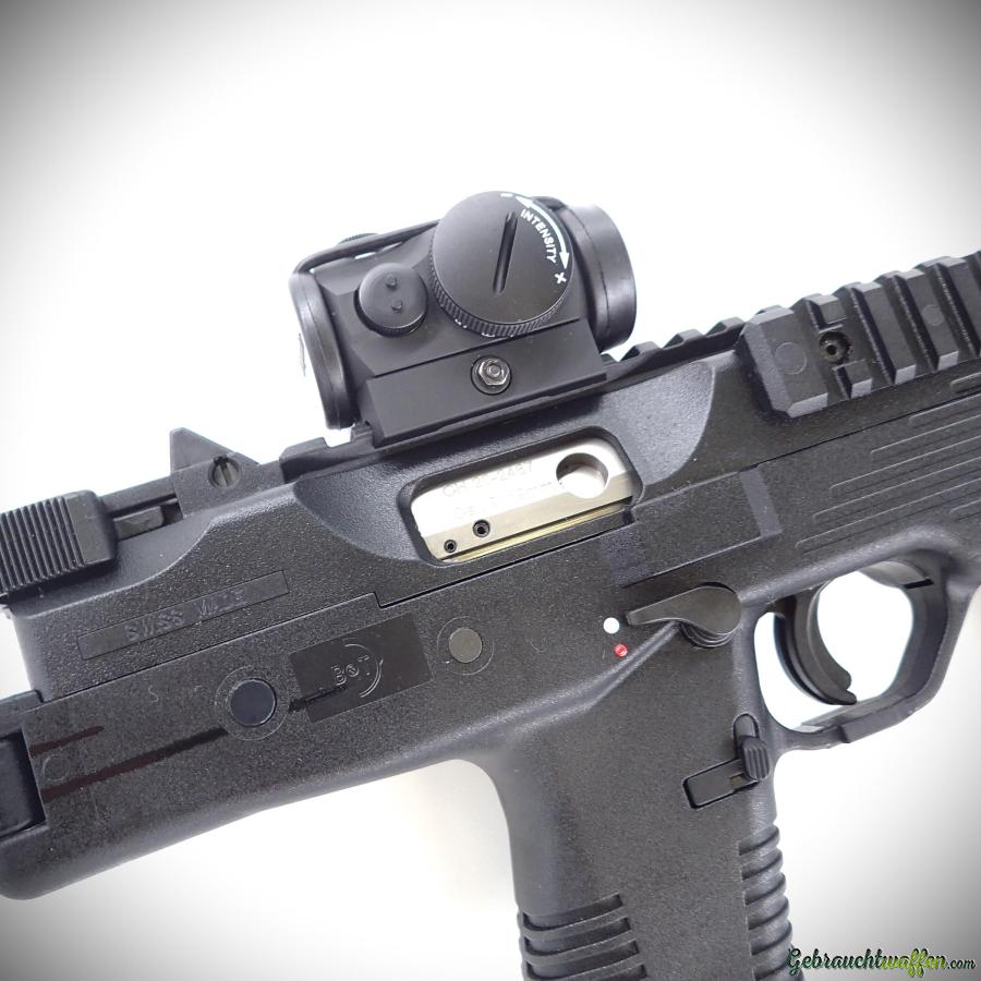 Pistolet B&T mod. TP9, cal. 9mmP, avec crosse pliable, équipé d'un point-rouge Aimpoint, occasion neuve, jamais tiré, livré avec sa boîte, accessoires, manuel et 3 chargeurs (1x 20coups, 2 x 30 coups).