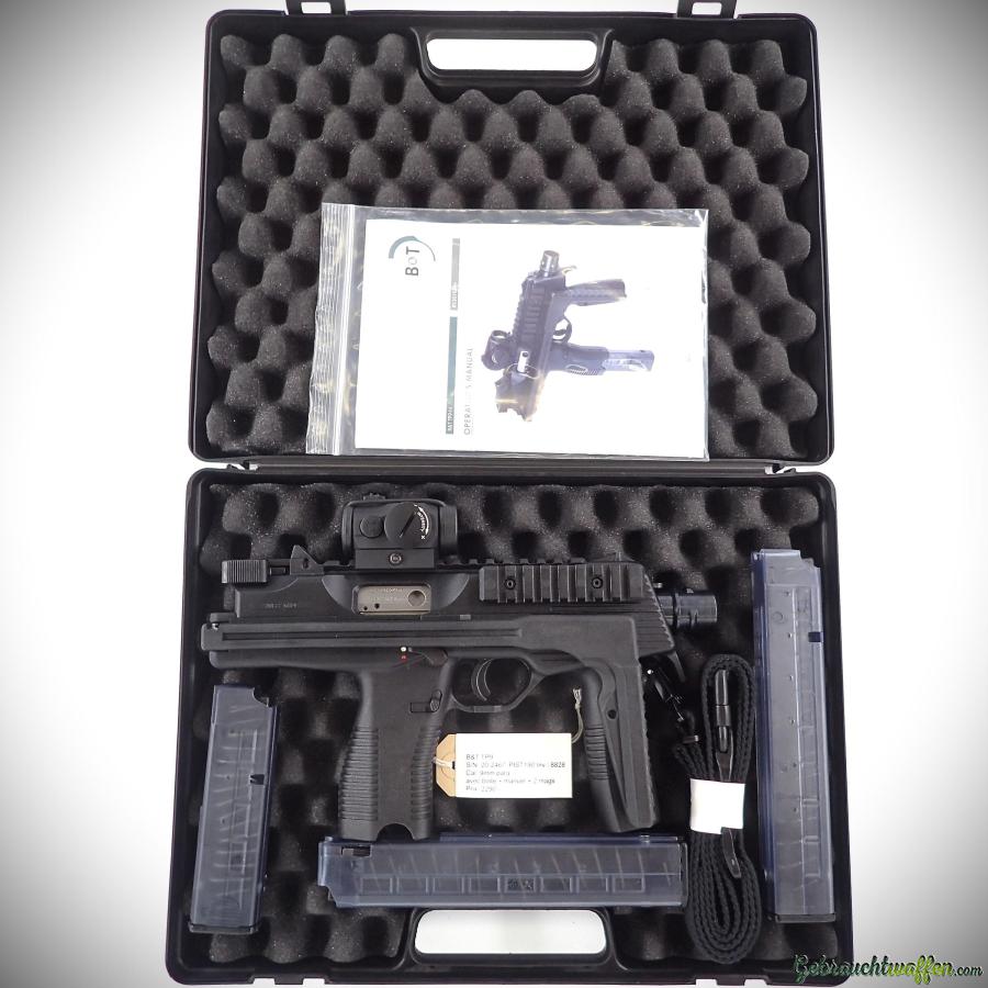 Pistole B&T mod. TP9, Kal. 9mmP, mit faltbarem Griff, ausgestattet mit einem Aimpoint-Rotpunkt, gebraucht, neu, noch nie geschossen, geliefert mit Box, Zubehör, Handbuch und 3 Magazinen (1x 20 Schuss, 2 x 30 Schuss).