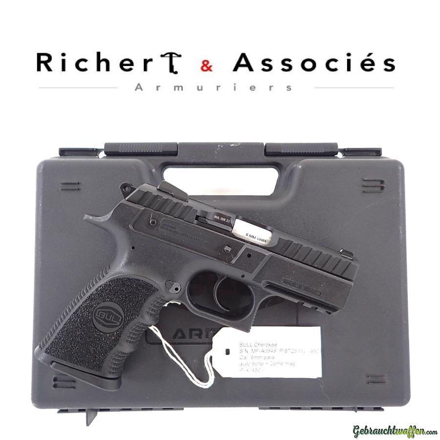 Pistolet Bul mod. Cherokee, cal. 9mmP, canon 4 pouces, carcasse en polymère, détente traditionnelle SA/DA, en très bon état, livré avec sa mallette, accessoires et 2ème chargeur d'origine.