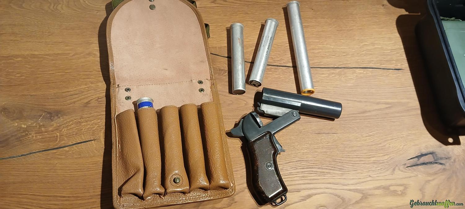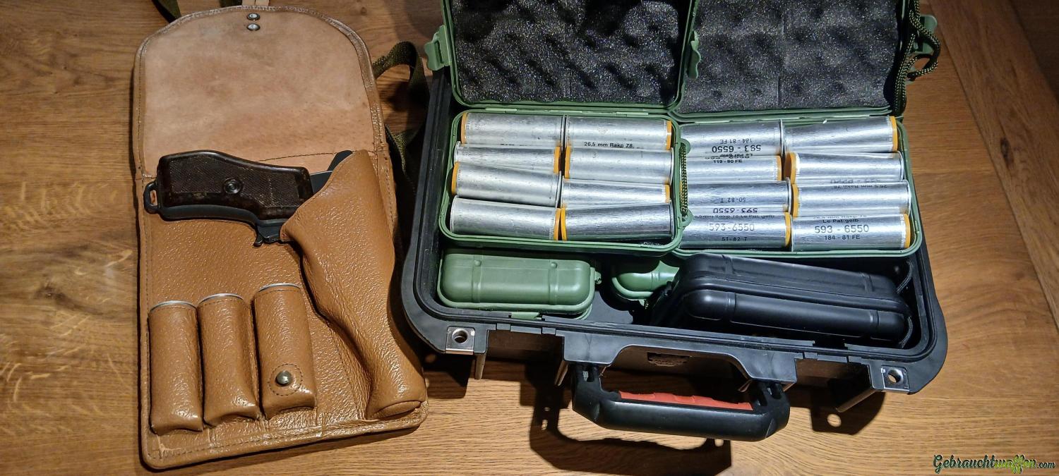 Tolles Set mit Signalpistole und Original Tasche aus Arsenalbestand. Inklusive Transportbox und gepolsterten 39 Schuss Diverse Munition. Sterne diverse Farben, Fallschirm und Rauch. Beachten Sie die Gesetzlichen bestimmungen zur Verwendung.