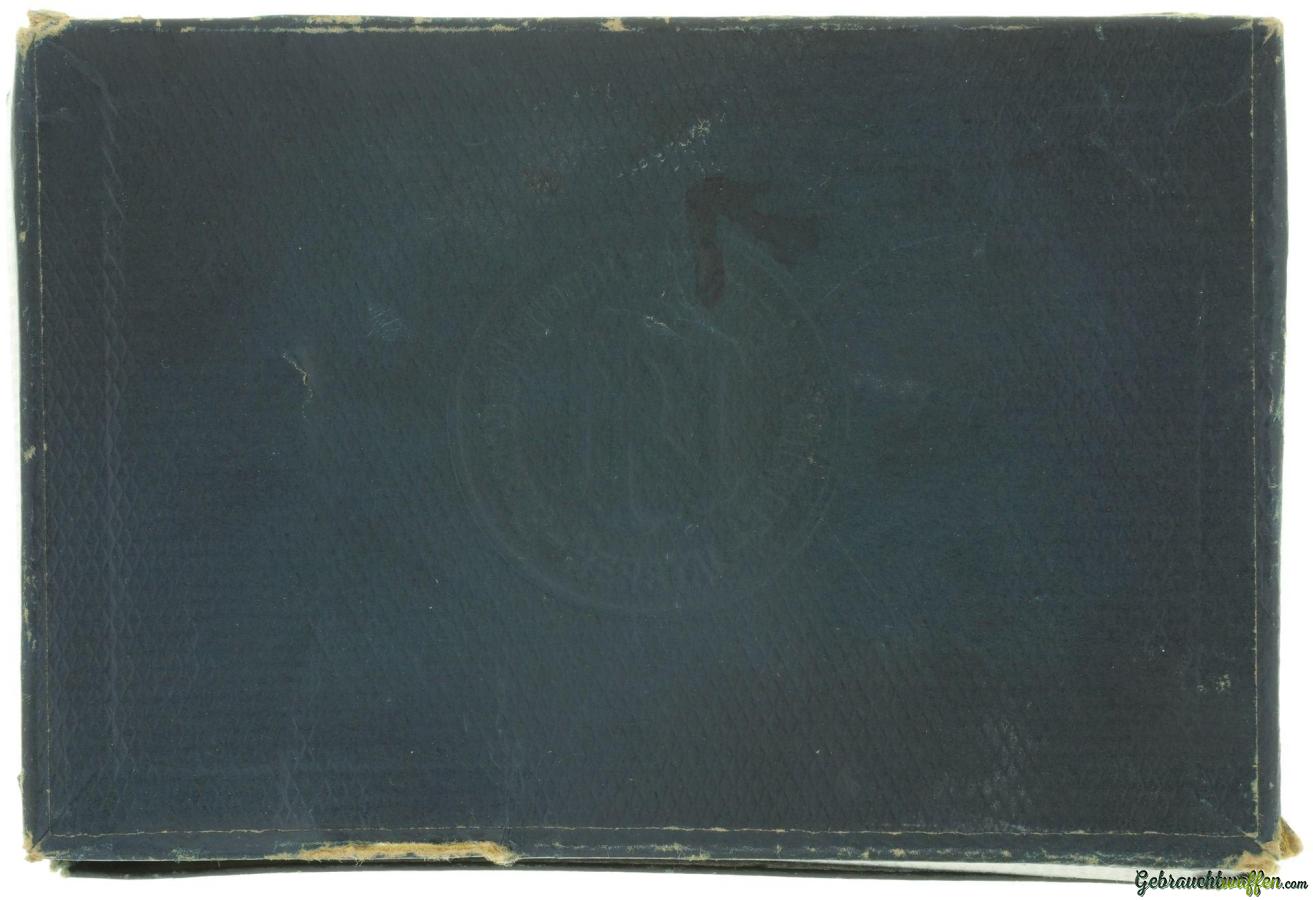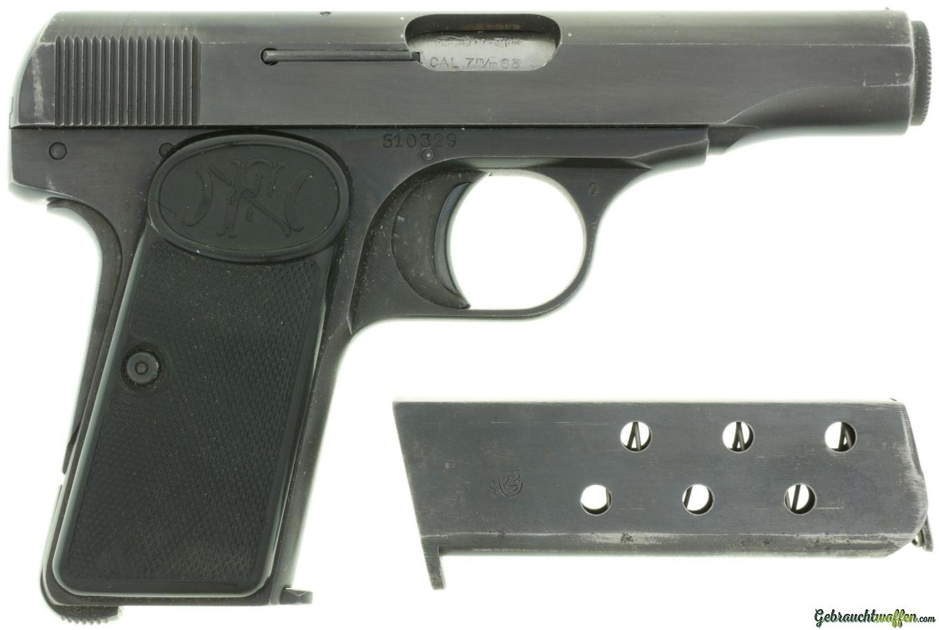 Pistole, FN 1910, Kal. 7.65mm LL 86mm, TL 155mm, brünierte Ganzstahlwaffe mit SA-Abzug, Schlagbolzenschloss, Handballensicherung, Magazin- und Flügelsicherung. Starre Visierung, Kunststoffgriffschalen mit Fischhautmuster und Firmenlogo "FN". Zubehör: Originale Schachtel und Reservemagazin.