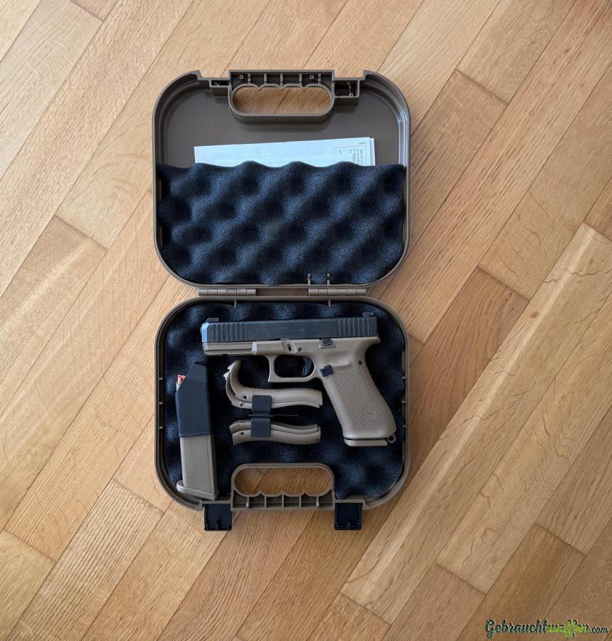 Die zivile Version der Glock 17 Gen5 FR (French) ist die modifizierte Version der Standard-Glock 17 Gen5 für die französischen Streitkräfte, erkennbar am Coyote-farbenen Griffstück.