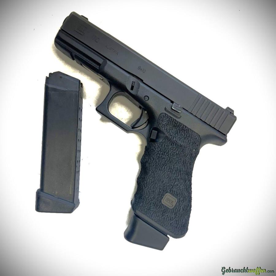GLOCK 17C Gen3 Pistole in sehr gutem Zustand, Schaft mit strukturiertem Griffstück, Kimme und Korn aus Metall mit Tritium-Einlagen, Lieferung mit 2. Magazin. Version mit Kompensator wird seit 2019 nicht mehr produziert.
