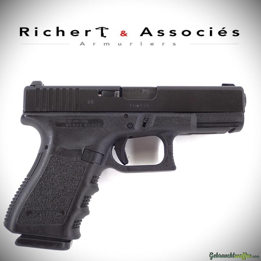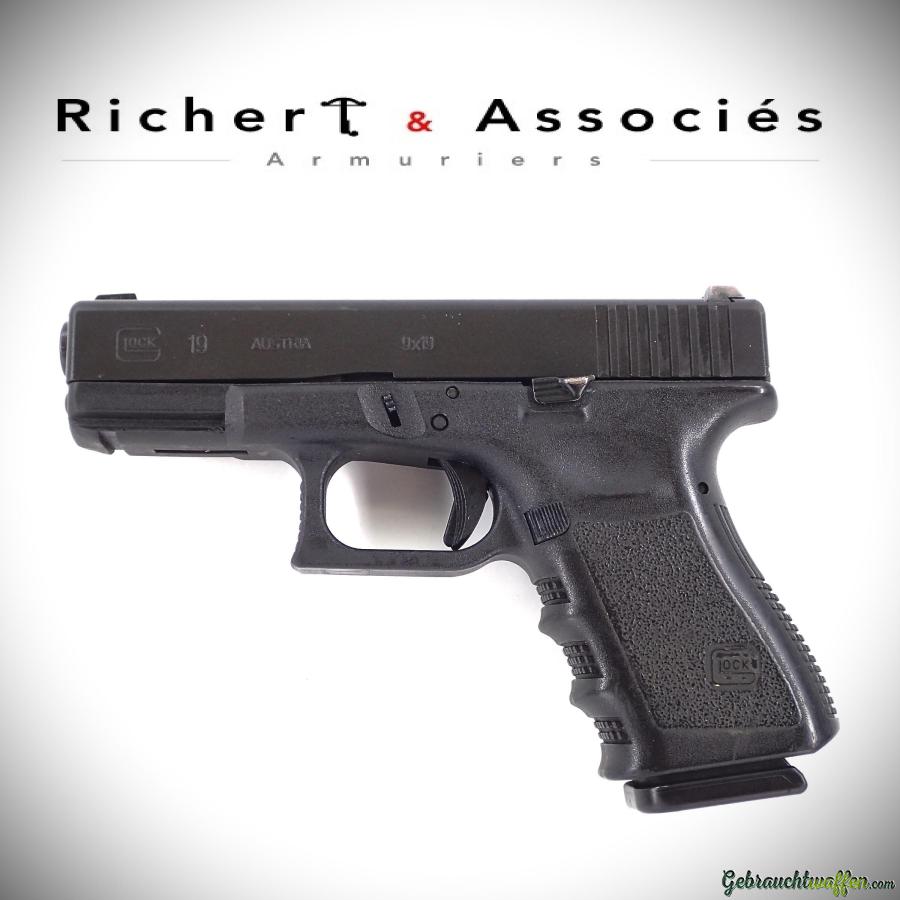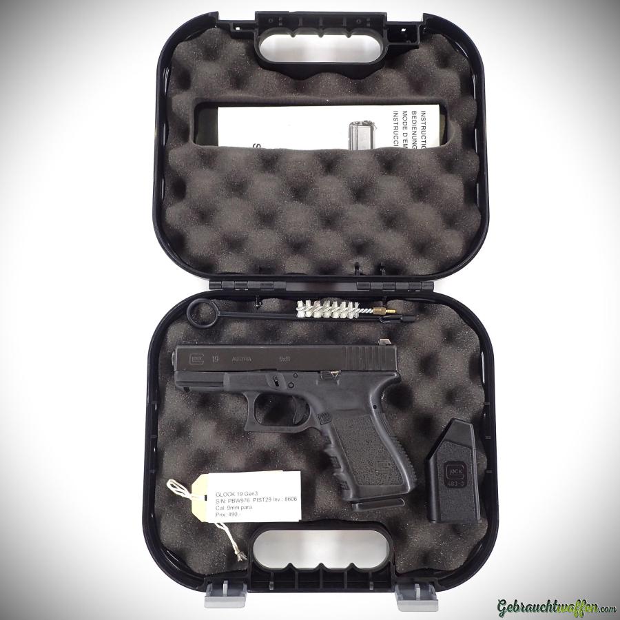 Glock pistol mod. 19 Gen 3, cal. 9mmP, ex-police of Lausanne, with steel front sight and rear sight with tritium markings, in very good condition. Comes with original box and accessories. Several pistols available, condition varies but very close to model in photos.