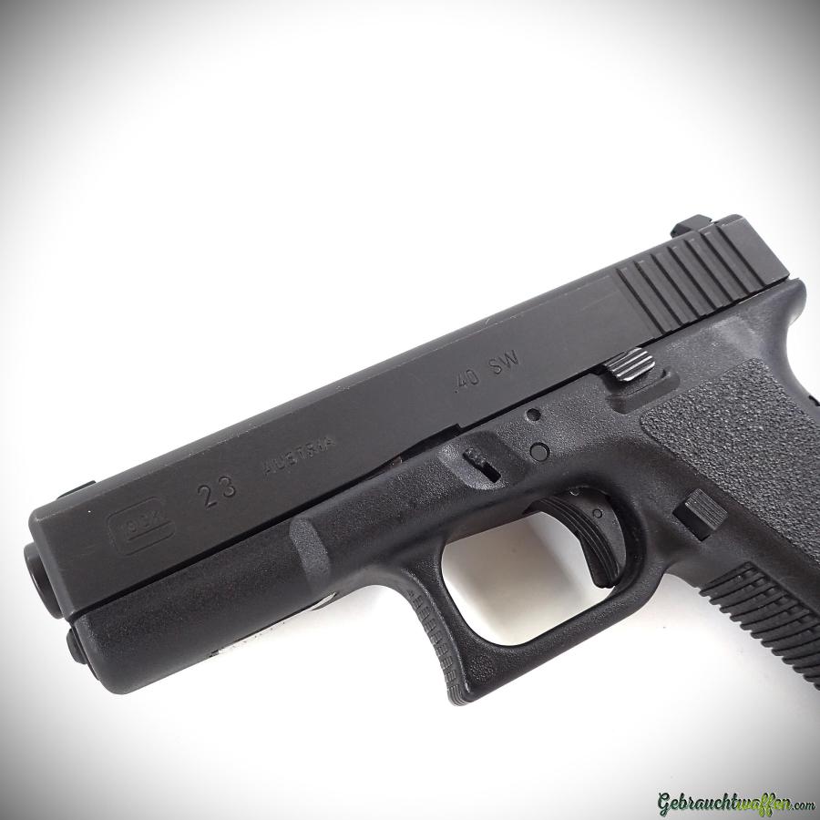 Glock-Pistole Mod. 23, Kal. 40S&W, 2. Generation, mit festem Korn und Kimme mit Tritiumeinlagen, in sehr gutem Zustand, mit zweitem Magazin geliefert.