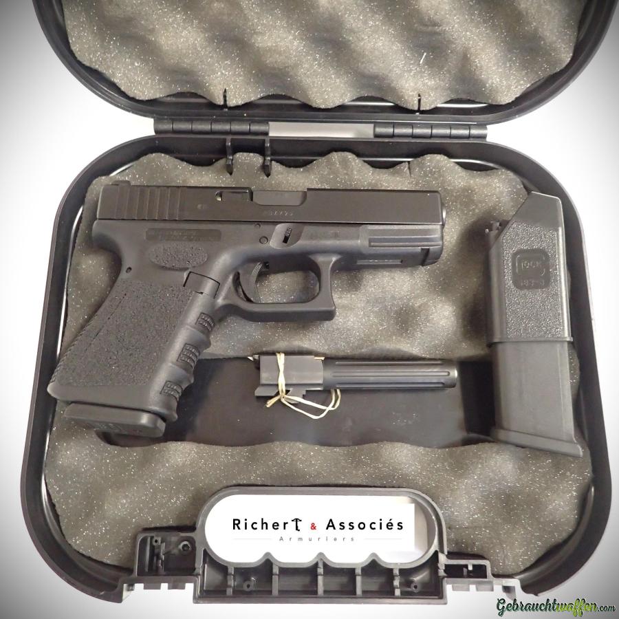 Pistole Glock 32, Kaliber 357sig, mit einem zweiten Wolf-Lauf in 40S&W, der das Schießen mit diesem Kaliber durch einfaches Auswechseln des Laufes ermöglicht, Federspeicher, Kimme und Korn aus Stahl, Verschlusshebel und Magazinauswurfknopf "extended", gummierte Griffaufkleber, in ausgezeichnetem Zustand, geliefert mit Box, Zubehör und zweitem Originalmagazin.