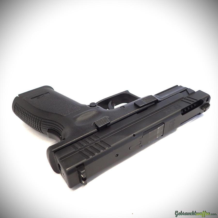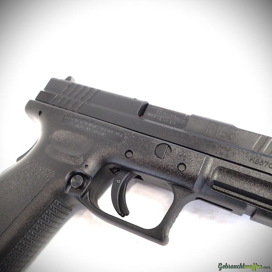 HS Produkt Pistole, Mod HS-9 Comp, Kal. 9mmP, Version mit aufgeweitetem Lauf und Verschluss für den Kompensationseffekt, Polymergehäuse, mit Schlagbolzen (Stricker-Typ), Schlagbolzensicherung am Abzug, festes Korn, in ausgezeichnetem Zustand, geliefert mit Originalkarton und Zubehör.