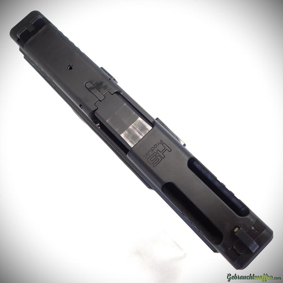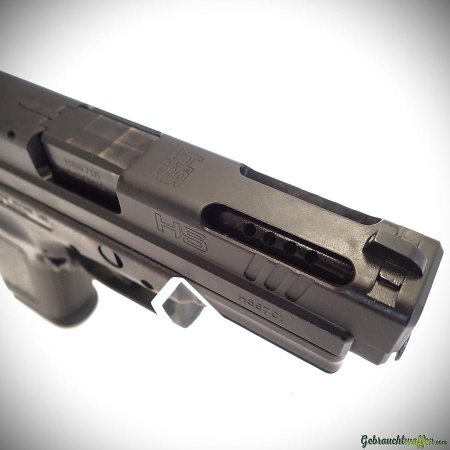HS Produkt pistol, mod HS-9 Comp, cal. 9mmP, version with flared barrel and breech for compensating effect, polymer frame, with stricker-type firing pin, firing pin safety on trigger, fixed rear sight, in excellent condition, delivered with original box and accessories.