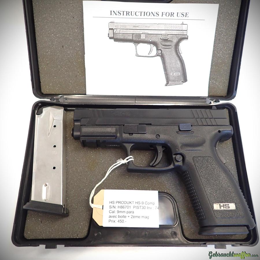 Pistolet HS Produkt, mod HS-9 Comp, cal. 9mmP, version à canon et culasse évasés pour l'effet compensateur, carcasse en polymère, à percuteur lancé (type stricker), sécurité de percuteur sur la détente, hausse fixe, en excellent état, livré avec sa boîte et accessoires d'origine.