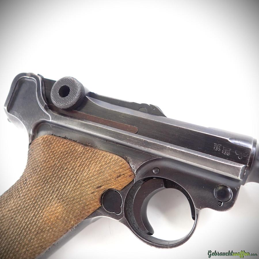 Mauser Pistole Modell P.08, Kaliber 9 mm P, Baujahr 1942, Seriennummer BYF. Die Waffe wurde für die VOPO (Schweizerische Volkspolizei) überholt, trägt aber noch die Originalmarkierungen. Verschluss und Lauf sind in sehr gutem Zustand. Das Äußere ist in gutem Zustand, bis auf den oberen Teil des Kniegelenks, der sich in einem akzeptablen Zustand befindet.