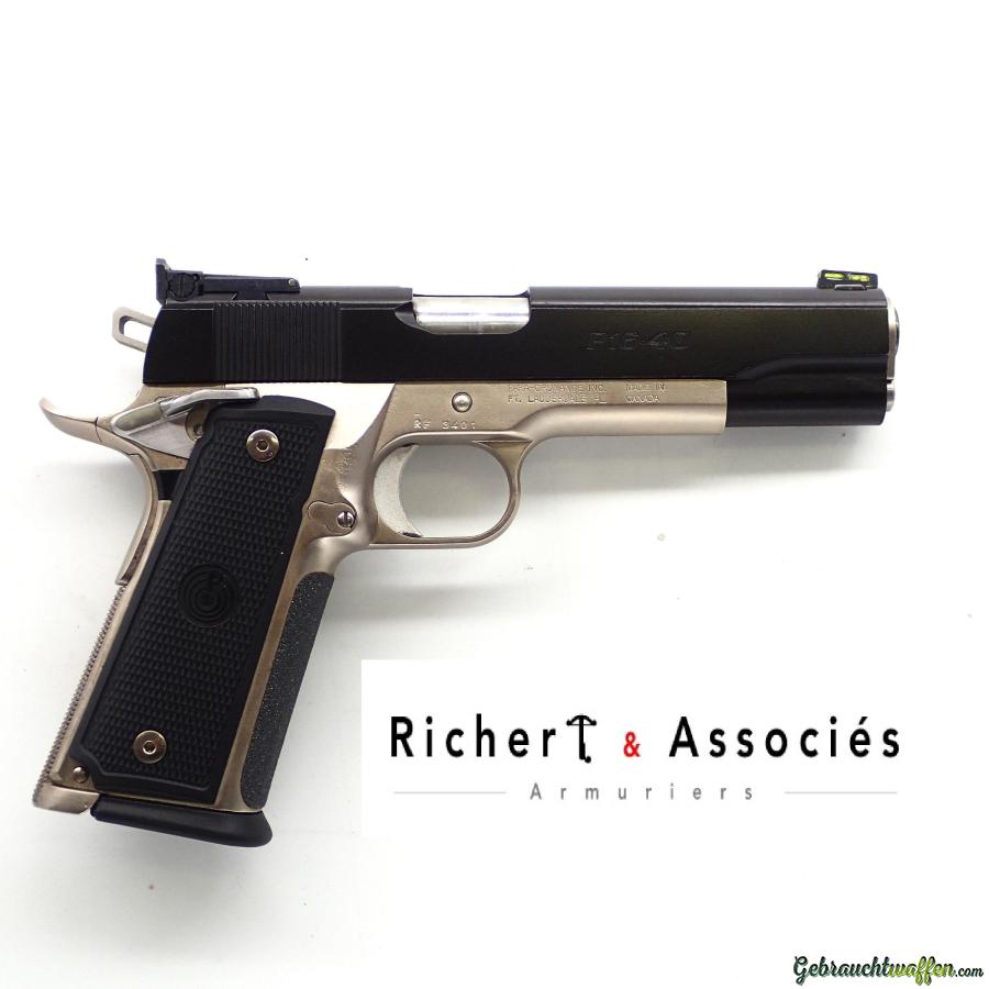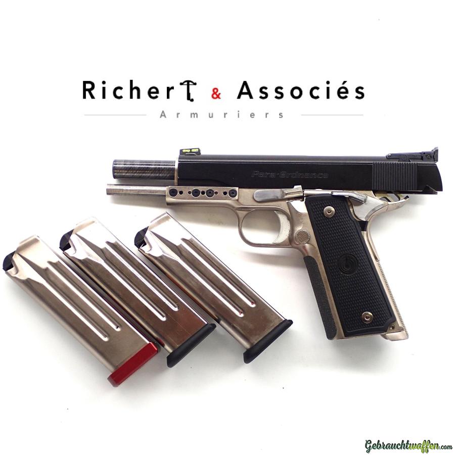 Para-Ordnance-Pistole, Modell P16-40, im Kaliber 10mmAuto, mit 1911-Gehäuse mit großer Kapazität, angepasst für dynamisches Schießen, P/C-Matchlauf, mit verstellbarem Bo-Mar-Visier und Fiberglaskorn, in sehr gutem Zustand. Wird mit 3 PO-Magazinen mit je 16 Schuss geliefert.