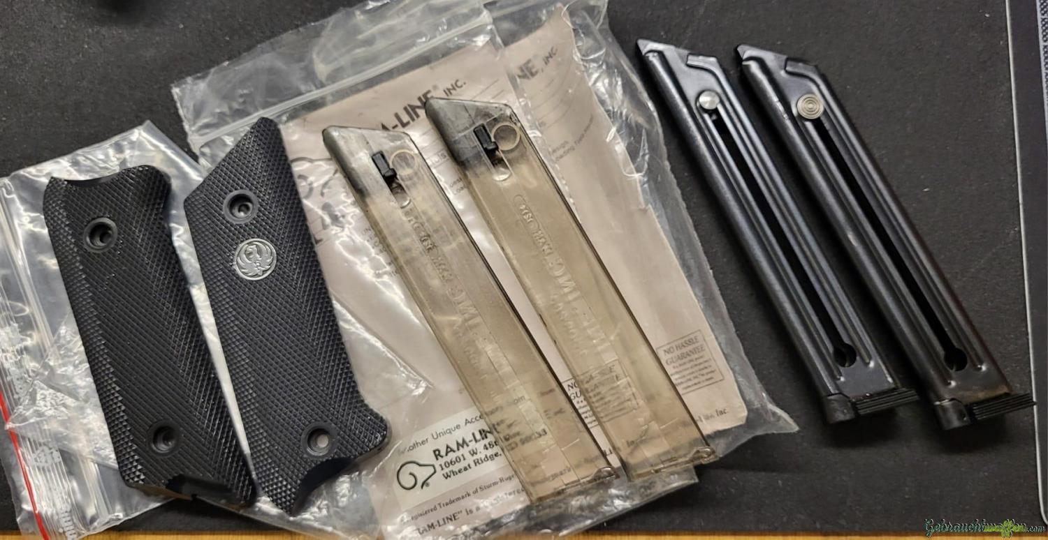 Originale Griffschalen, zwei RAM Magazine und zwei Ruger Stahlmagazine sind dabei.