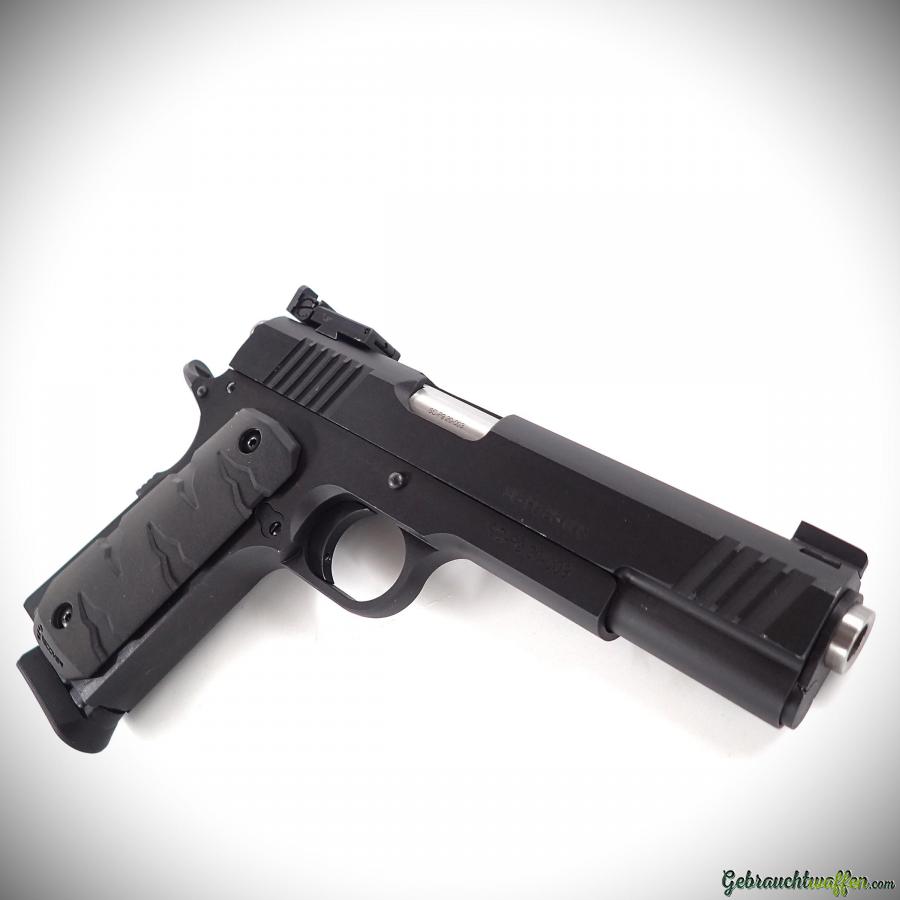 Sehr schöne Schwab Custom Pistole, Modell SC-P9, Kal. 9mmP, 5-Zoll-Lauf, Schweizer Fabrikat, mattschwarzes Finish. Mit Ausnahme des Laufs wurde die Pistole vollständig von einem Schweizer Büchsenmacher hergestellt und originalgetreu angepasst. Sie verfügt über ein verbessertes Abzugssystem, Alu-Abzug, „squeletonized“ Hammer, „Biberschwanz“-Griffsicherung, erweiterte Verschluss-Sicherung und eine verstellbare Bo-Mar Kimme.