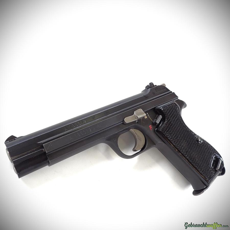 AKTION - Basispaket: SIG P49 Pistolen, Kaliber 9 mm P, ehemalige Armee, zweite Serie (P210-2), Seriennummern von 116.000 bis 213.000 A, teilweise mit Hämmerli-Montage, geprüft und generalüberholt (Schlagwerk, Auswurf etc.), Gesamtzustand sehr gut bis ausgezeichnet, aber sehr ähnlich dem abgebildeten Modell, Lieferung mit Einzelmagazin.