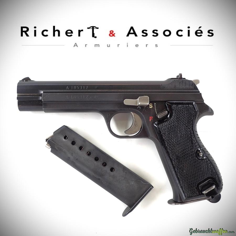 PROMOTION - Pack Plus: Pistolets SIG mod. P49, cal. 9mmP, ex-armée, de seconde série (P210-2), SN allant de A116'000 à A213'000, certains à montage Hämmerli, contrôlés et révisés (percussion, éjection, etc.), état général allant de très bon à excellent, mais très proche du modèle pris en photo, livré avec 2 chargeurs.