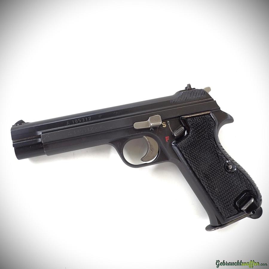 AKTION - Plus-Paket: SIG P49 Pistolen, Kaliber 9 mm P, ehemalige Armee, zweite Serie (P210-2), Seriennummern von 116.000 bis 213.000 A, teilweise mit Hämmerli-Montage, geprüft und überholt (Schlagwerk, Auswurf etc.), Gesamtzustand sehr gut bis ausgezeichnet, aber dem abgebildeten Modell sehr ähnlich, mit zwei Magazinen.