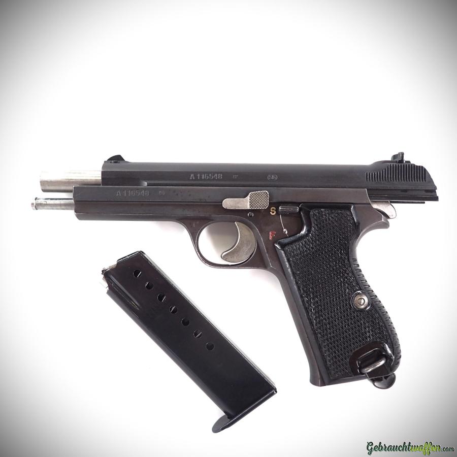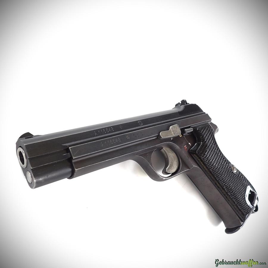 SIG pistol mod. P49, cal. 9mmP, so-called "transitional" model produced in approximately 6,000 units (SN A114,000 to A120,000), in very good condition, delivered with leather case and 2nd magazine.