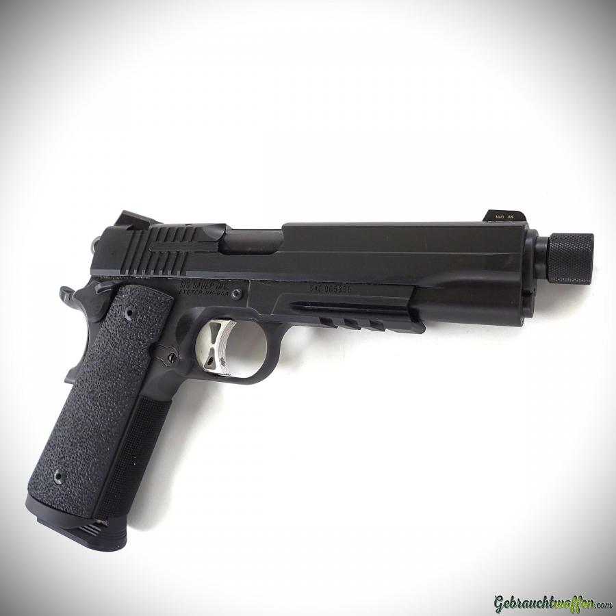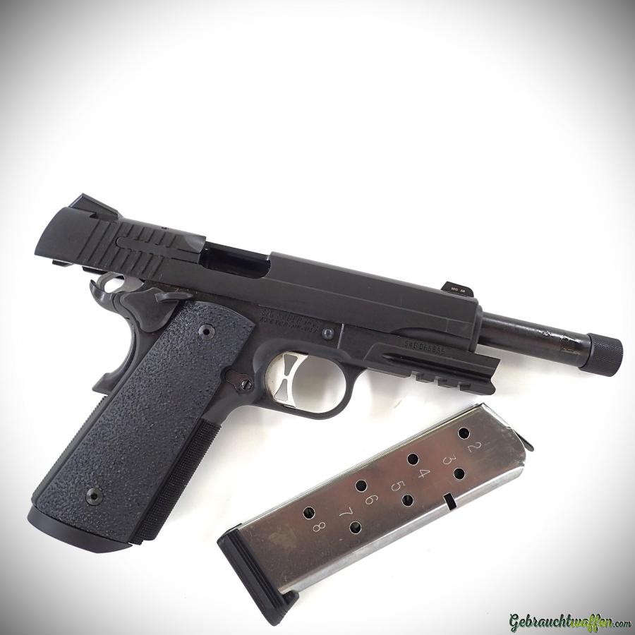 Sig-Sauer Mod. 1911R TACOPS Pistole, Kaliber 45acp, 5,5-Zoll-Gewindelauf, originalgetreue Anpassung mit Biberschwanzsicherung, beidseitiger Schlittensicherung, leichterem Hahn, vergrößertem Magazinschacht, Fischhaut an der Griffvorderseite, Picatinny-Schiene an der Gehäusevorderseite, in sehr gutem Zustand, mit Koffer und 3 Ersatzmagazinen.
