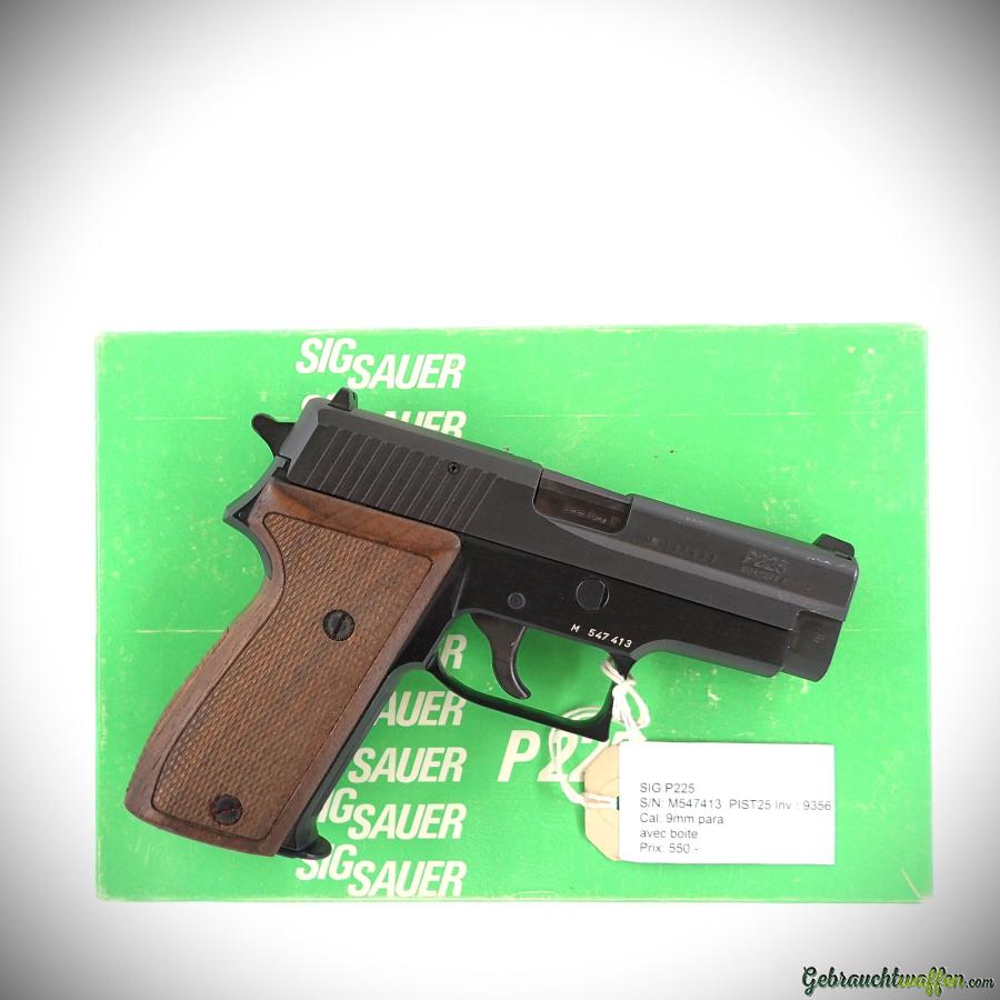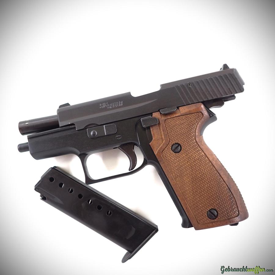 Sig Sauer P225 pistol, 9mmP caliber, German-made with Swiss assembly, wooden grips, in very good condition, comes with a box.