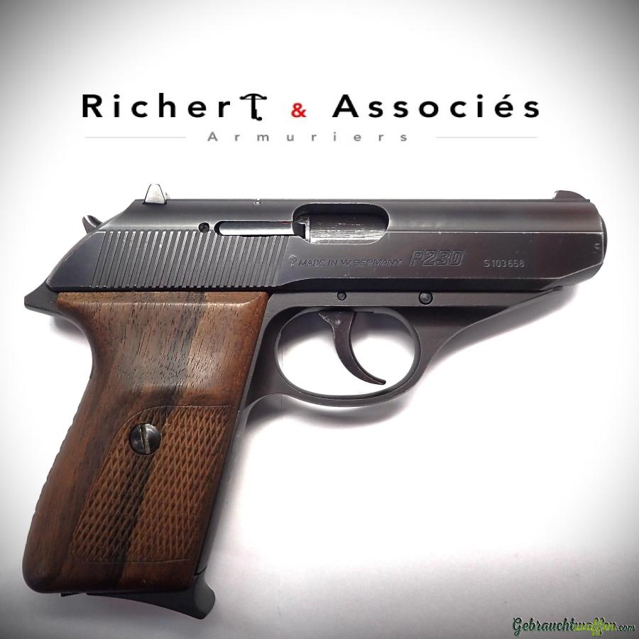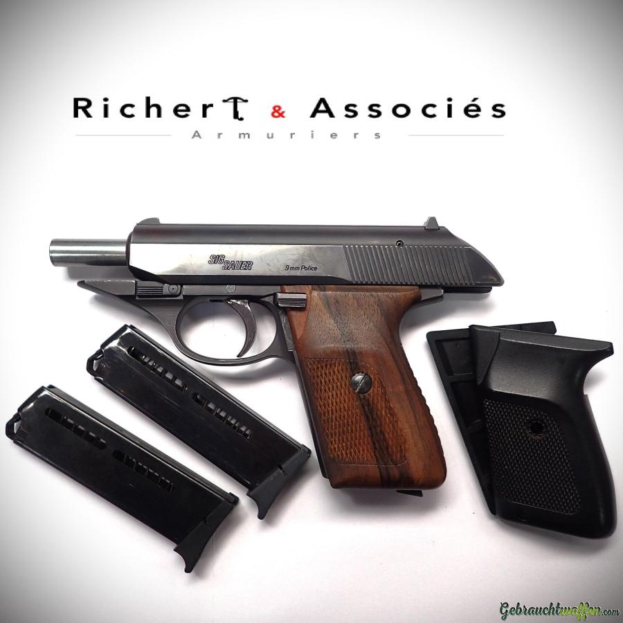 Pistolet Sig-Sauer, modèle P230, cal. 9mm Police, ex-police de Genève, fabriqué en 1976 (code HG), en très bon état, livré avec sa boîte, 2ème chargeur et ses plaquettes plastique d'origine.