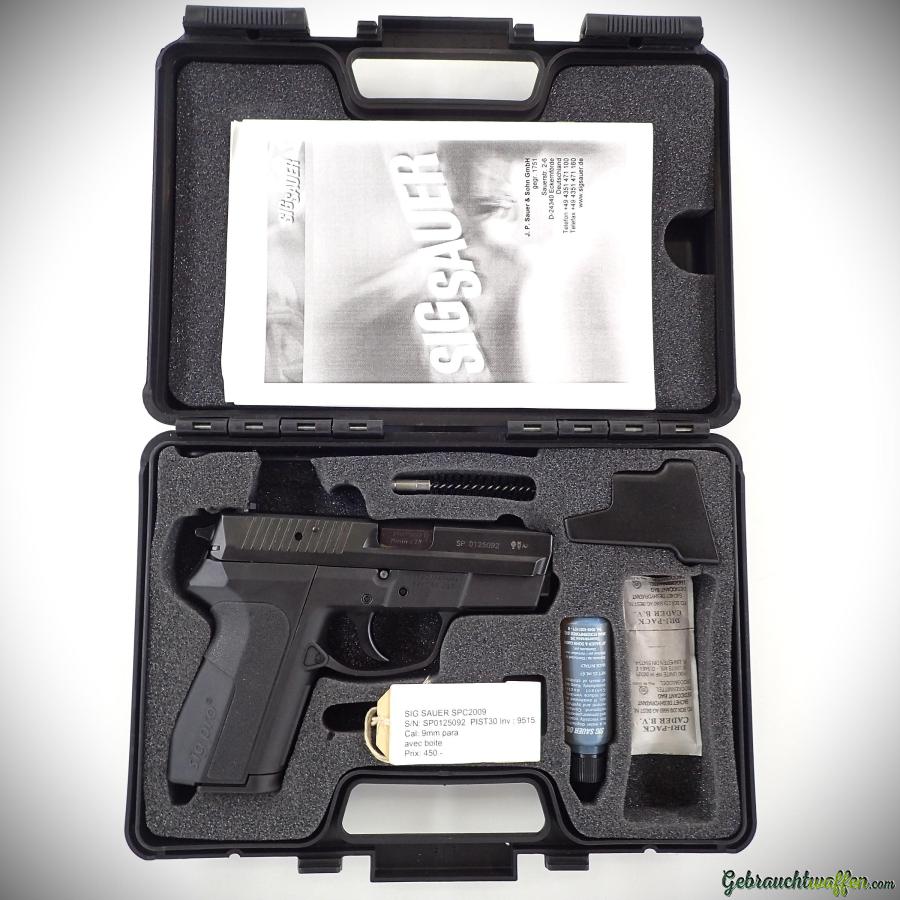 Pistolet Sig-Sauer mod. SPC2009, cal. 9mmP, canon de 3.5 pouces, carcasse en polymère, détente traditionnelle SA/DA, version compacte du modèle SP2009, en très bon état, livré avec sa boîte, manuel et accessoires d'origine.
