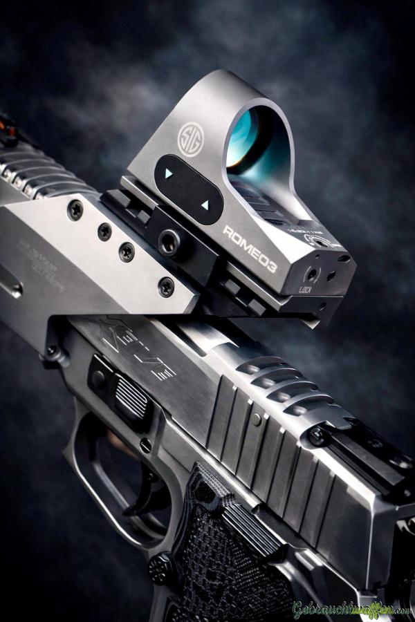 Die Pistole hat zu dem eine Hochglanz polierte Schlittenflanke und kommt mit dem originalen X-Mount Rotpunktvisir Montagegerüst. Ausserdem enthalten sind ein Sig Romeo3 Rotpunktvisir, zwei 19 Schuss Magazine und ein zusätzliches Paar OD Green Hogue Griffschalen und original Hartschalenkoffer