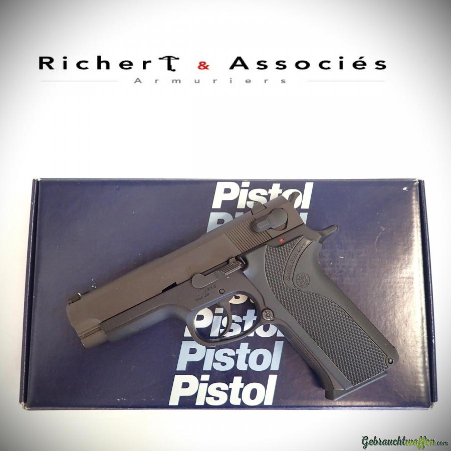 Pistolet de 3ème génération Smith & Wesson, mod. 411, cal. 40S&W, chargeur 11 coups, carcasse en alliage léger et culasse en acier, détente DA/SA, occasion neuve, jamais tiré, livré avec sa boîte, accessoires et 2ème chargeur d'origine.