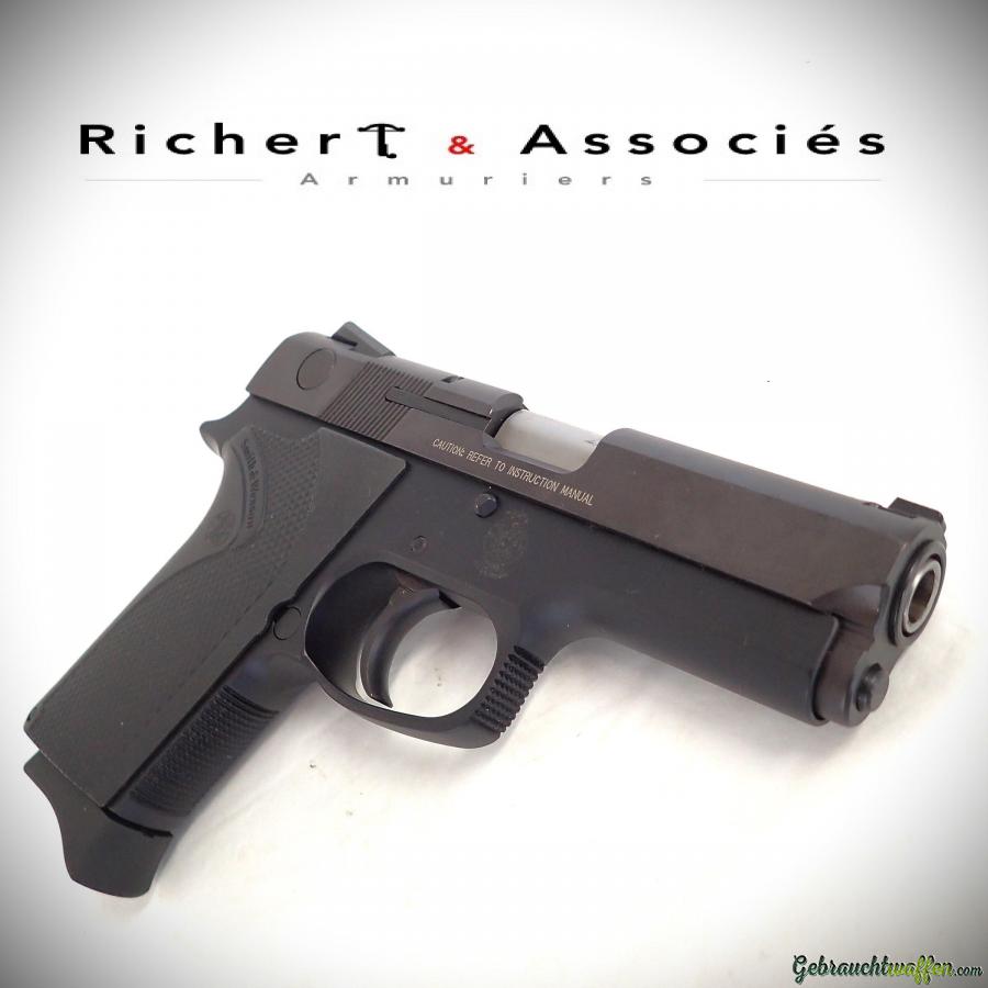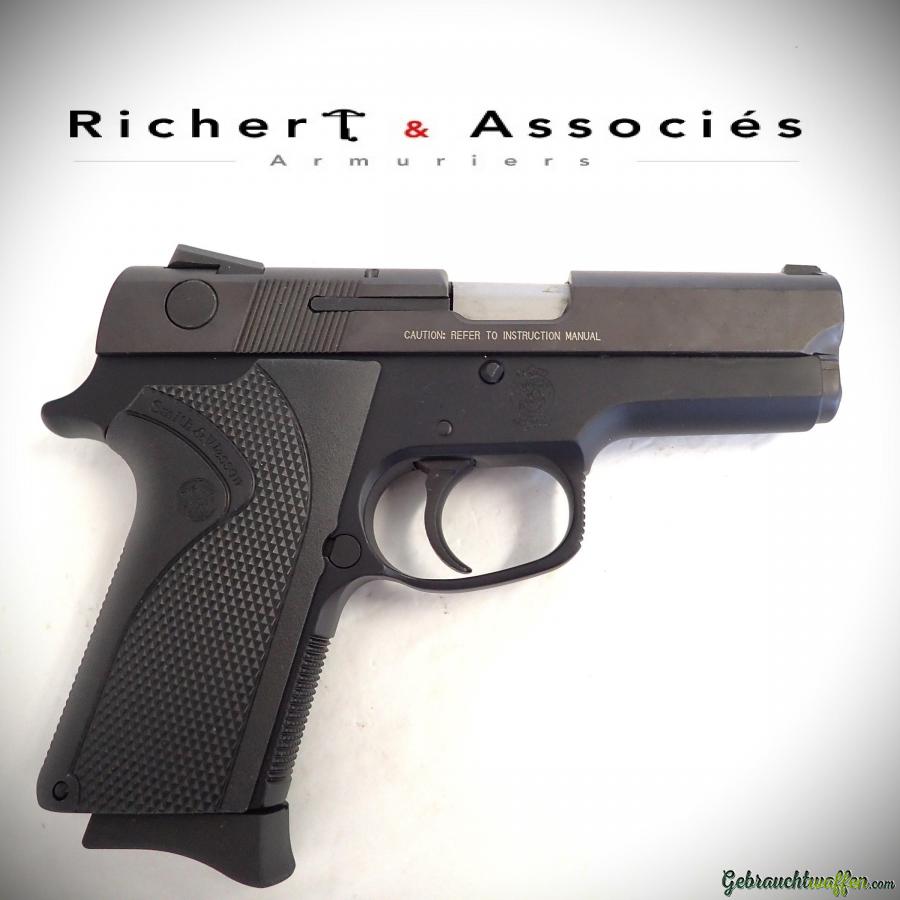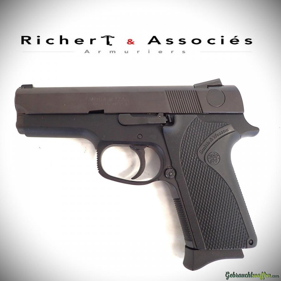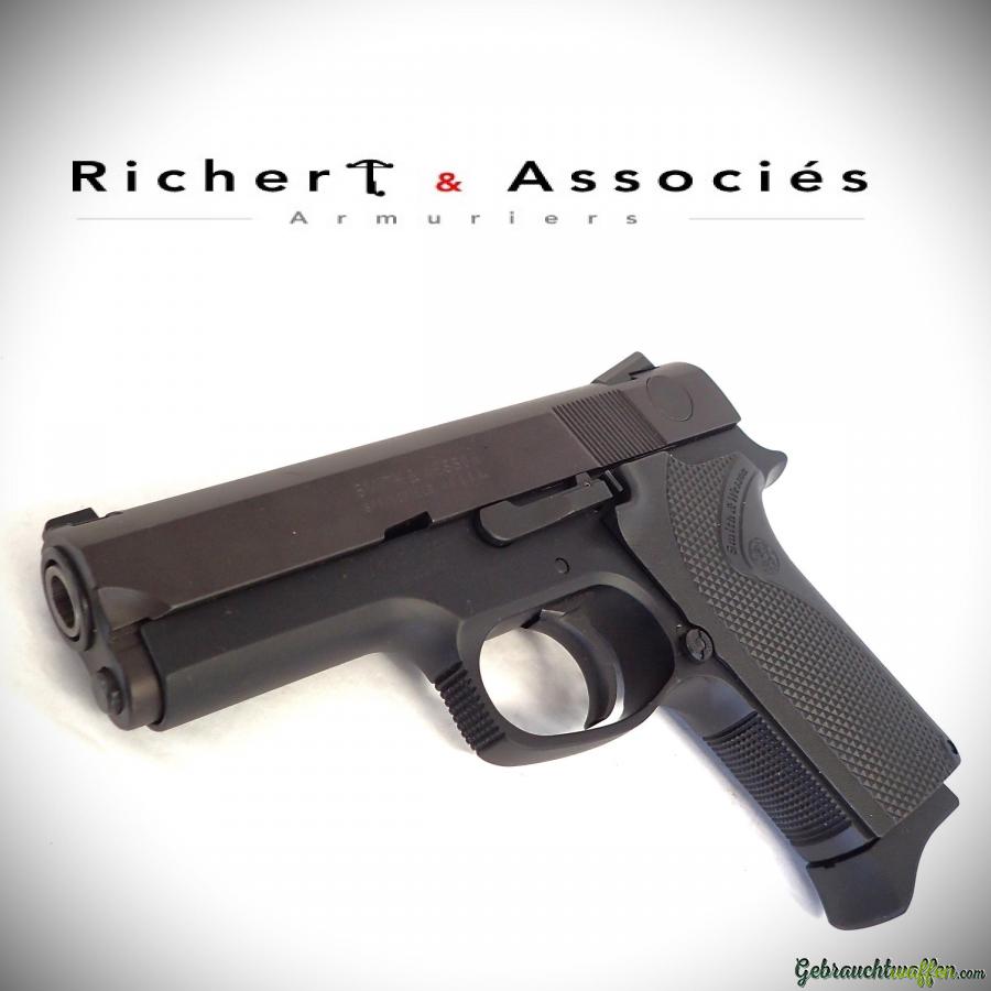 Pistolet Smith & Wesson mod. 3954, cal. 9mmP, détente DAO, chargeur de 8 coups, carcasse en alliage léger et culasse en acier, hausse Novak, occasion neuve, jamais tiré, livré avec sa boîte, accessoires et 2ème chargeur d'origine.
