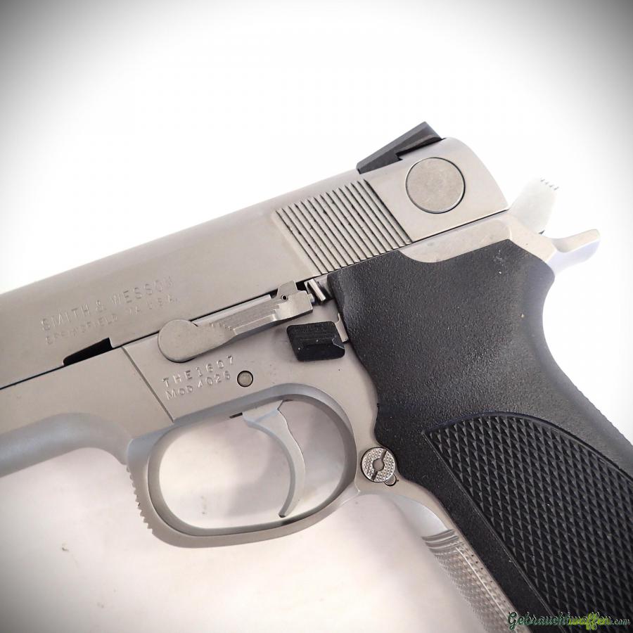 Pistole Smith & Wesson mod. 4026, Kal. 40S&W, 4-Zoll-Lauf, 11-Schuss-Magazin, DA/SA-Abzug, Edelstahlgehäuse und -verschluss, Hahnentspannungshebel am Gehäuse, *bobbed"-Hammer, Novak-Visier, gebraucht, neu, ungeschossen, Lieferung mit Box, Zubehör und 2tem Originalmagazin.