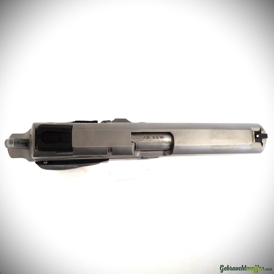 Smith & Wesson pistol mod. 4026, cal. 40S&W, 4-inch barrel, 11-shot magazine, DA/SA trigger, stainless steel frame and breech, hammer decocking lever on frame, *bobbed" hammer, Novak rear sight, used new, never fired, delivered with box, accessories and 2nd original magazine.