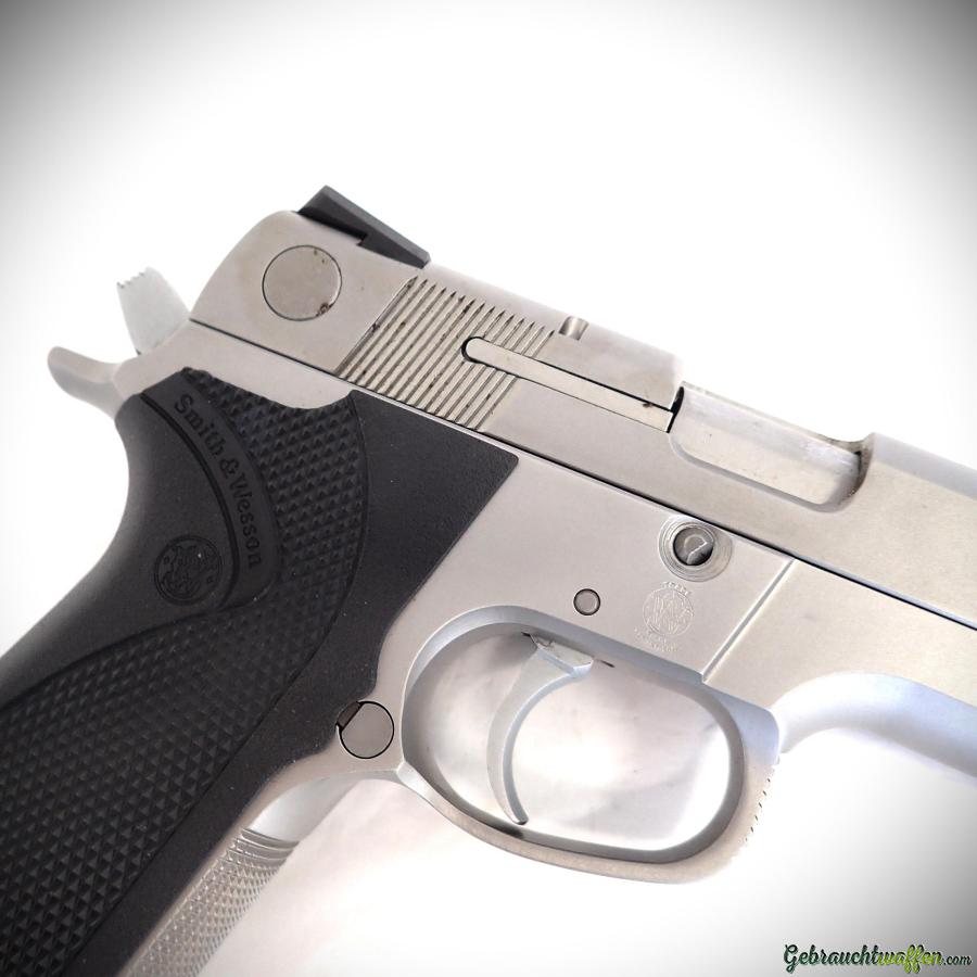 Pistole Smith & Wesson mod. 4026, Kal. 40S&W, 4-Zoll-Lauf, 11-Schuss-Magazin, DA/SA-Abzug, Edelstahlgehäuse und -verschluss, Hahnentspannungshebel am Gehäuse, *bobbed"-Hammer, Novak-Visier, gebraucht, neu, ungeschossen, Lieferung mit Box, Zubehör und 2tem Originalmagazin.
