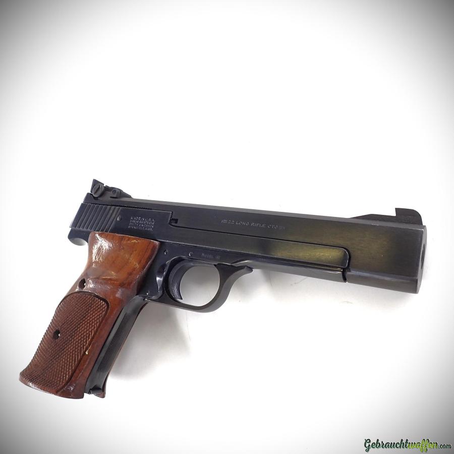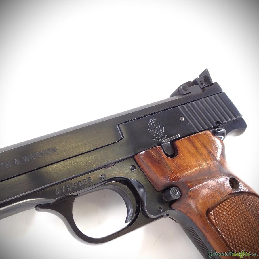 Smith & Wesson Modell 41 Pistole, Kaliber .22 LR, 5-1/2"-Lauf, SAO-Abzug, verstellbare Kimme, geriffelter Holzgriff mit Daumenauflage für Rechtshänder, Baujahr 1981, in exzellentem Zustand, inklusive zweitem Magazin.