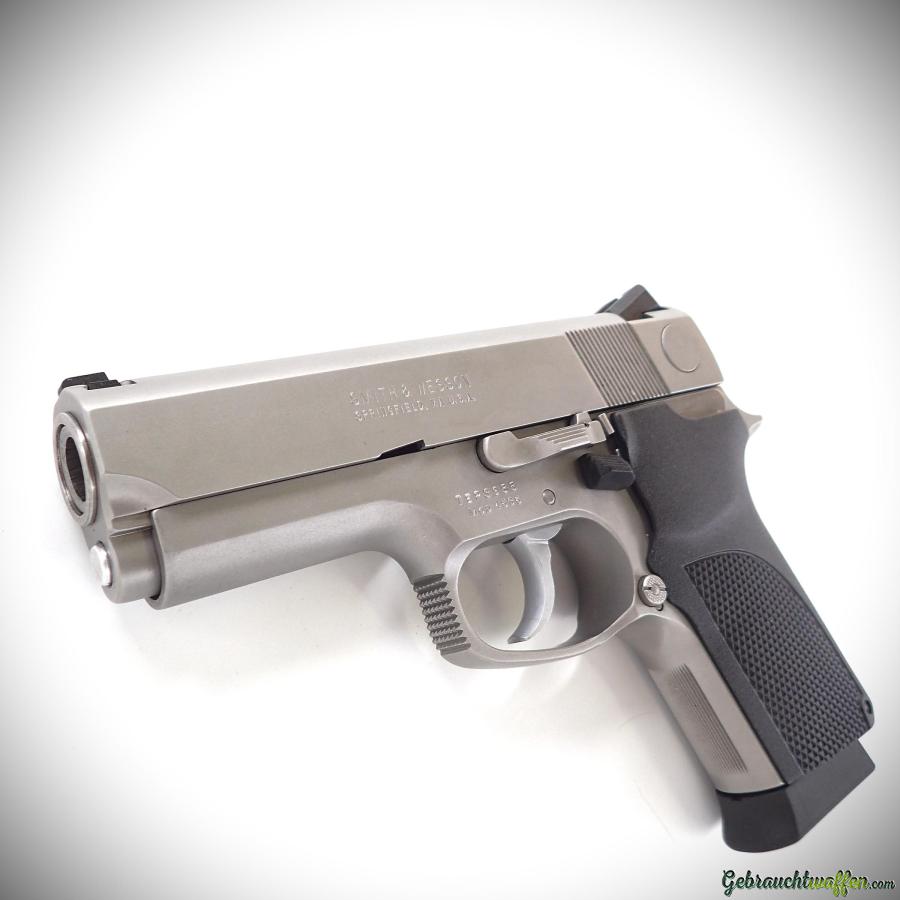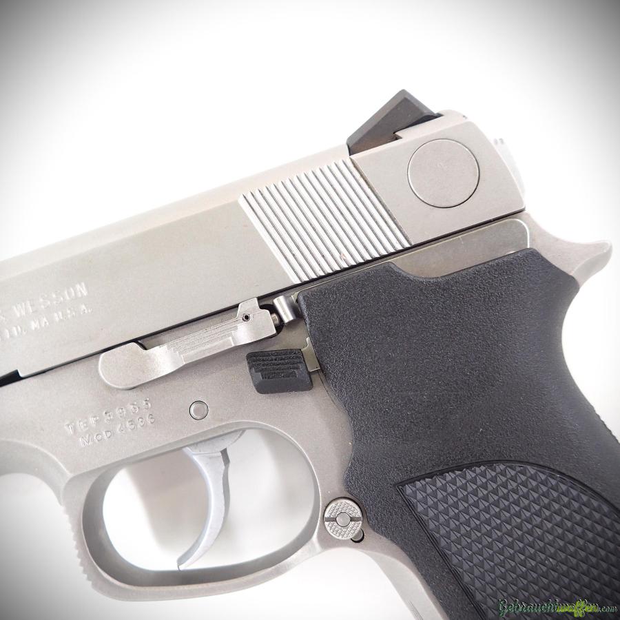 Smith & Wesson Pistole Mod. 4536, Kal. 45acp, 3-3/4-Zoll-Lauf, einreihiges 7-Schuss-Magazin, DA/SA-Abzug, Rahmen und Schlitten aus Edelstahl, Entspannhebel am Rahmen, gewellter Hahn, Novak-Visierung, neuwertig, ungeschossen, mit Box, Zubehör und zweitem Originalmagazin.