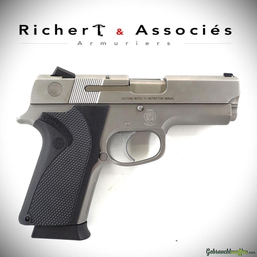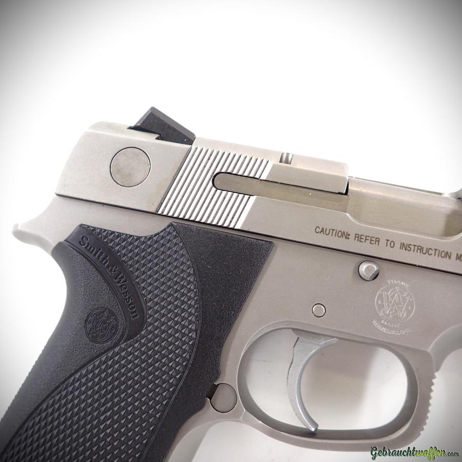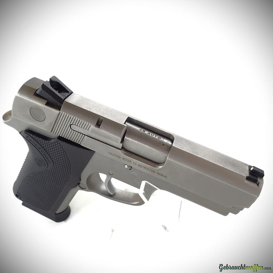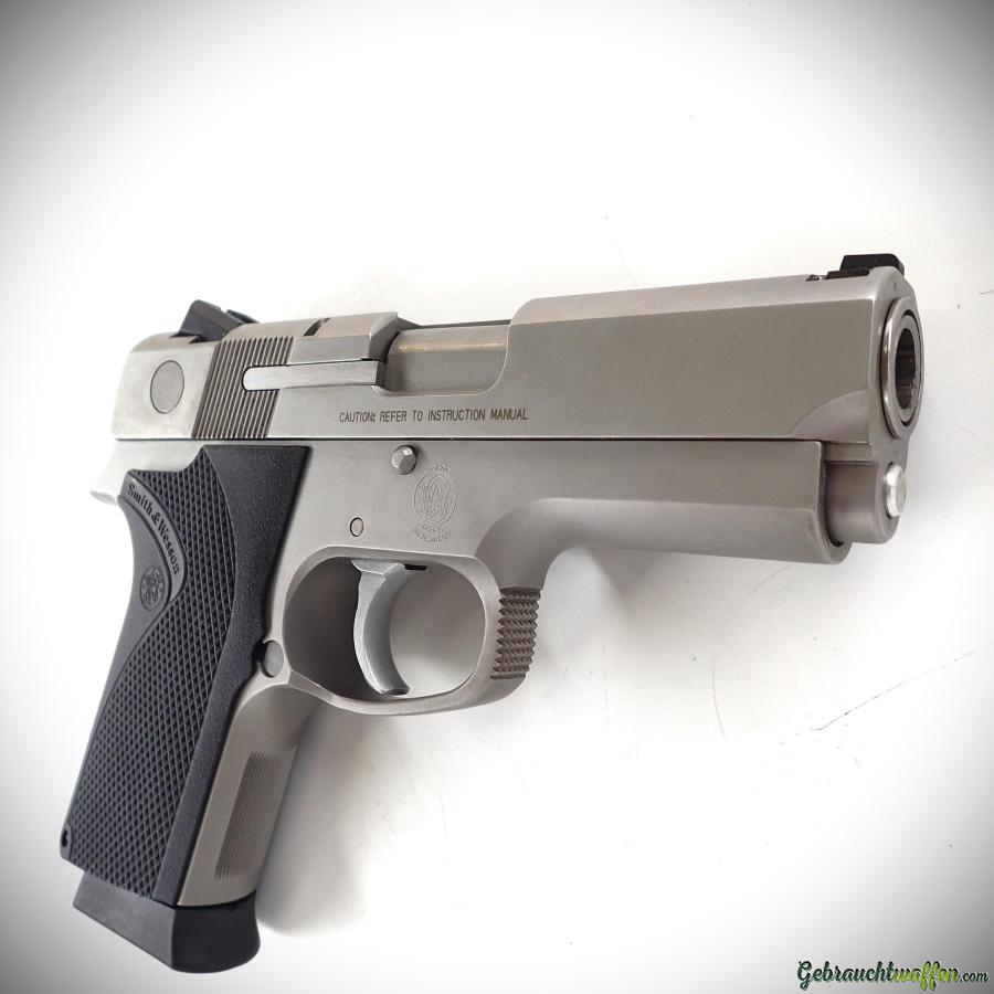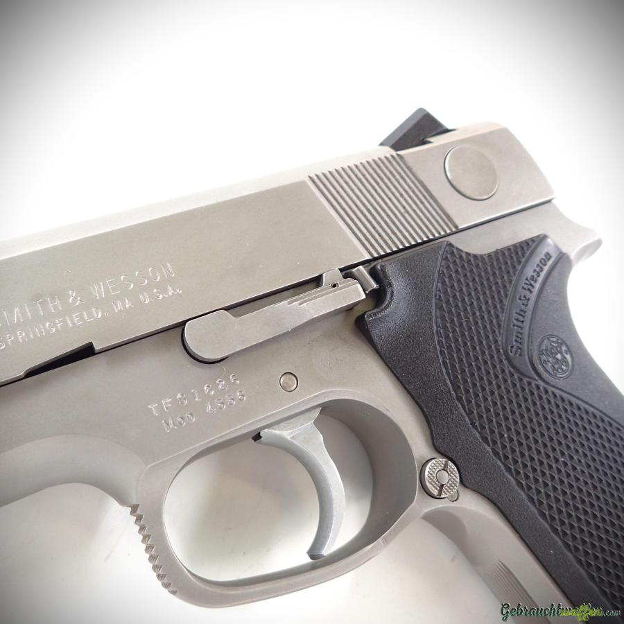S&W Pistole Modell 4556, Kaliber .45 ACP, DAO-Abzug, 7-Schuss-Magazin, 3-3/4"-Lauf, Stahlschlitten und -rahmen, flache, feste Novak-Visierung, Baujahr 1991, neuwertig, ungeschossen, inklusive Originalverpackung, Zubehör und einem zweiten Originalmagazin.