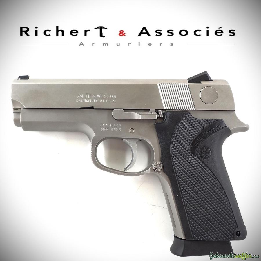 Pistolet S&W mod. 4556, cal. 45acp, détente DAO, chargeur de 7 coups, canon de 3-3/4 pouces, culasse et carcasse en acier, hausse fixe profil bas type Novak, fabriqué en 1991, occasion neuve, jamais tiré, livré avec sa boîte, accessoires et 2ème chargeur d'origine.