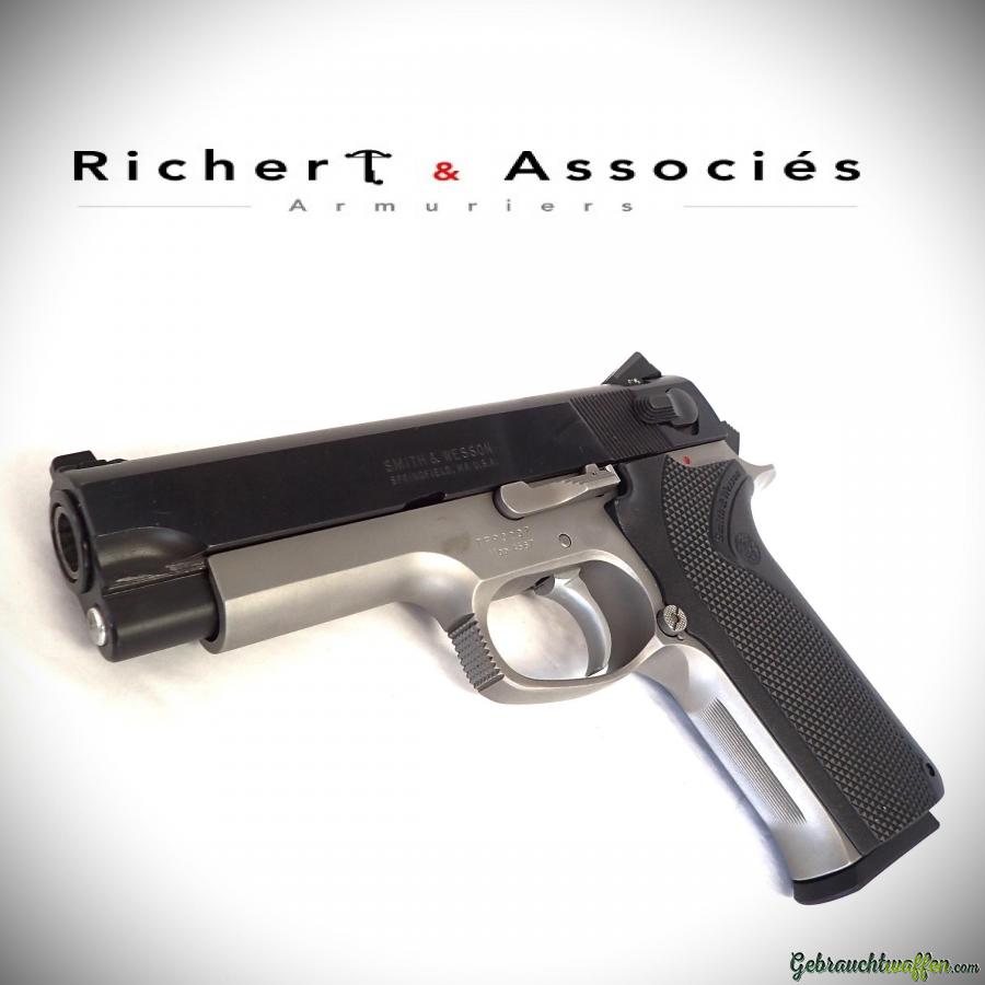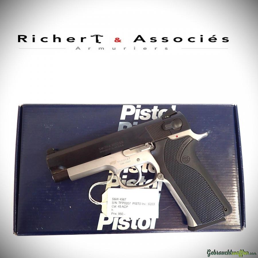 Pistolet semi-compact Smith & Wesson mod. 4567, cal. 45acp, canon de 4.25 pouces, chargeur de 8 coups, carcasse et culasse en acier, finition duo-tone, levier de désarmement du chien ambidextre, marteau "bobbed", hausse Novak, fabriqué à moins de 1'250 unités en 1991, occasion neuve, jamais tiré, livré avec sa boîte, accessoires et 2ème chargeur d'origine.