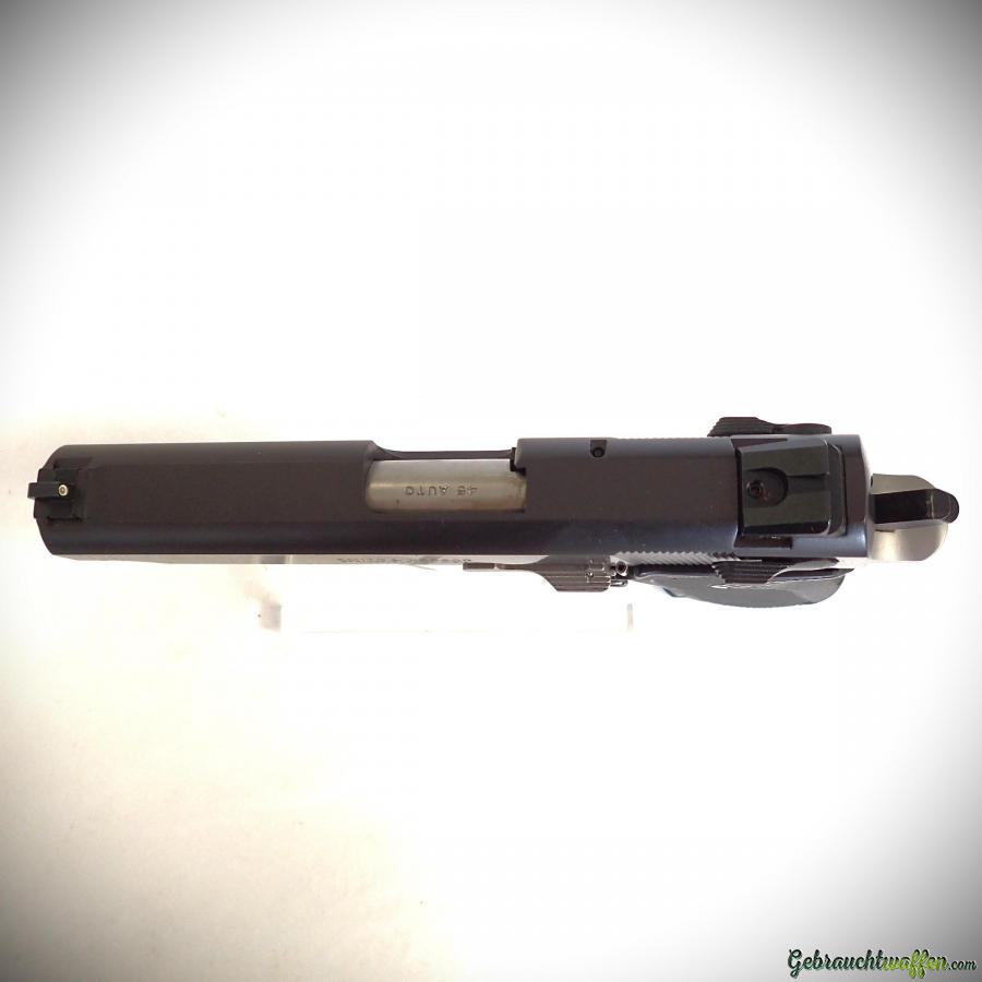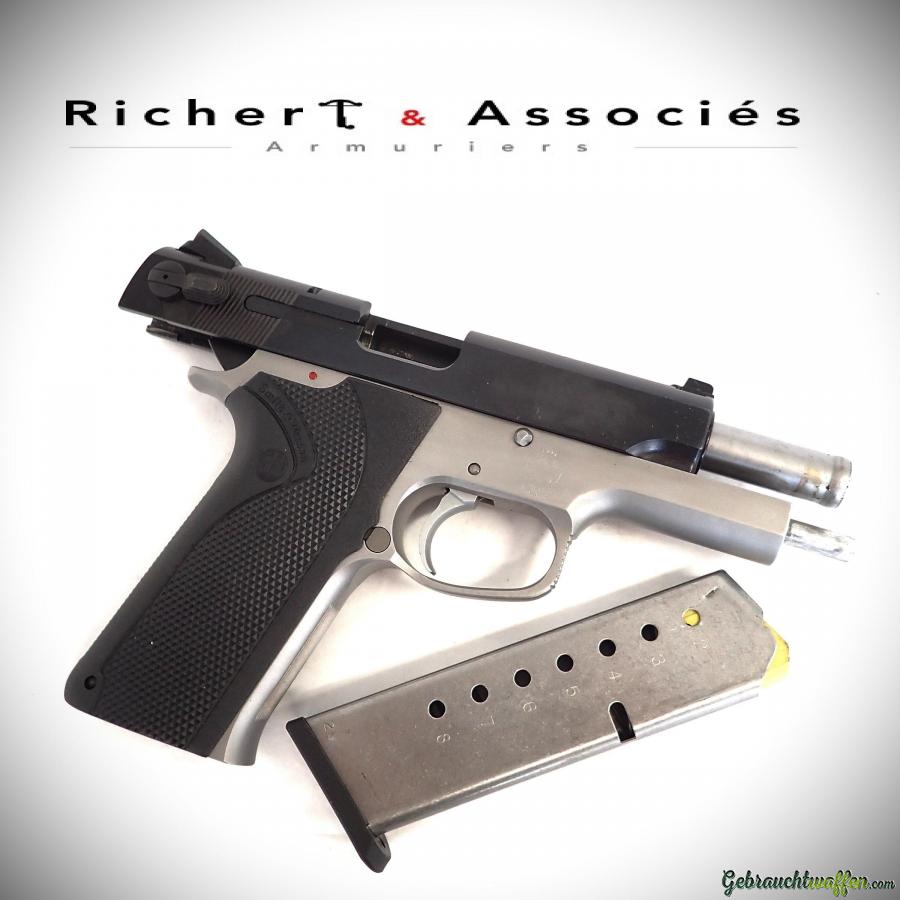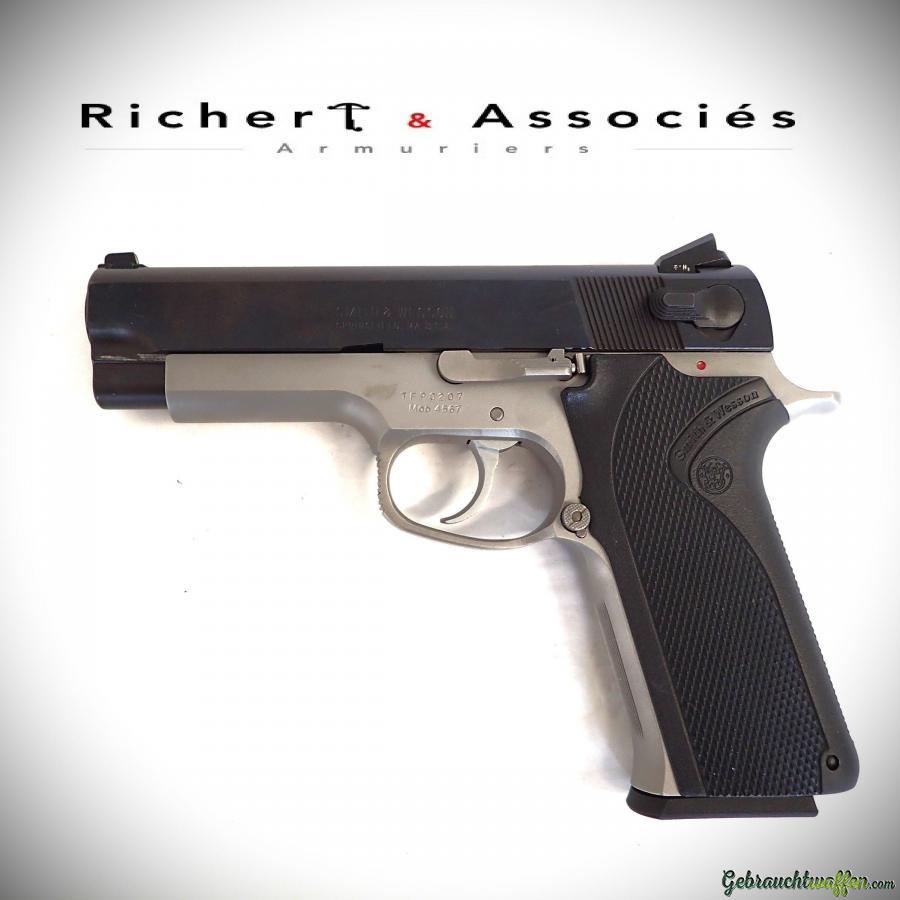 Pistolet semi-compact Smith & Wesson mod. 4567, cal. 45acp, canon de 4.25 pouces, chargeur de 8 coups, carcasse et culasse en acier, finition duo-tone, levier de désarmement du chien ambidextre, marteau "bobbed", hausse Novak, fabriqué à moins de 1'250 unités en 1991, occasion neuve, jamais tiré, livré avec sa boîte, accessoires et 2ème chargeur d'origine.