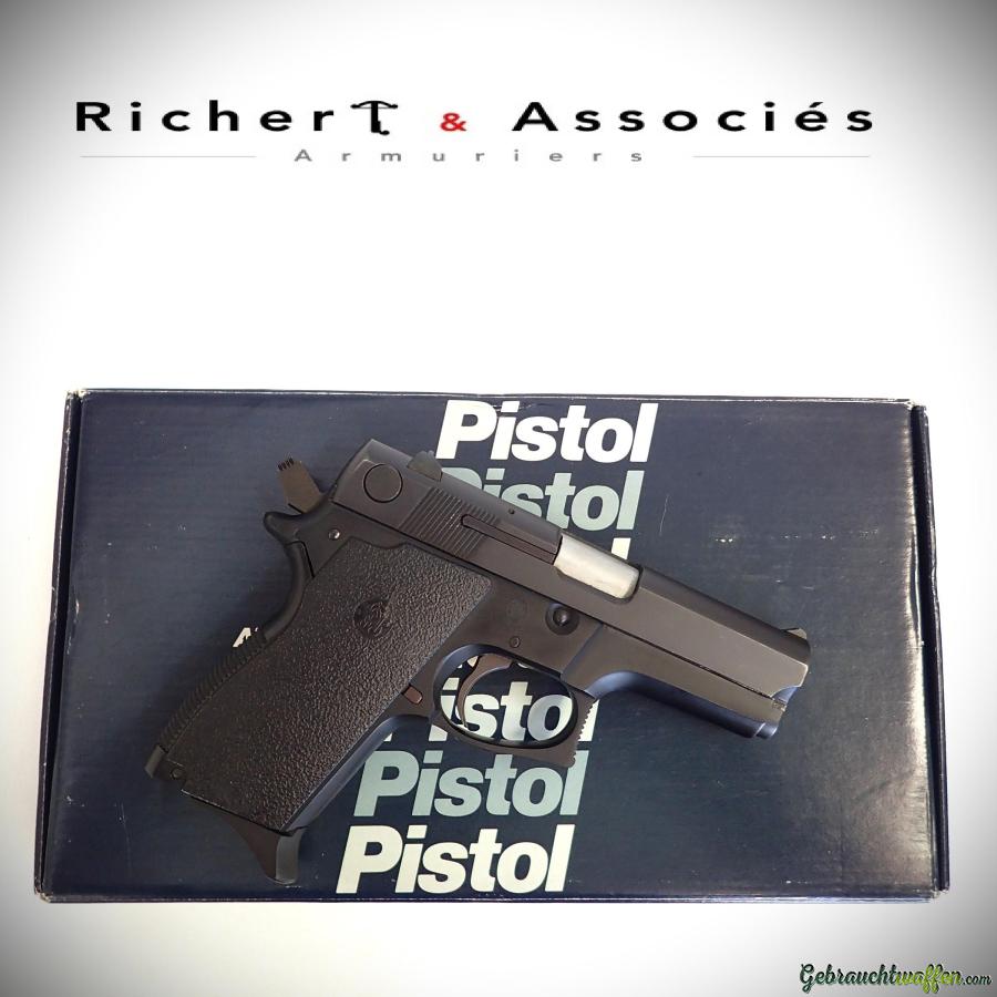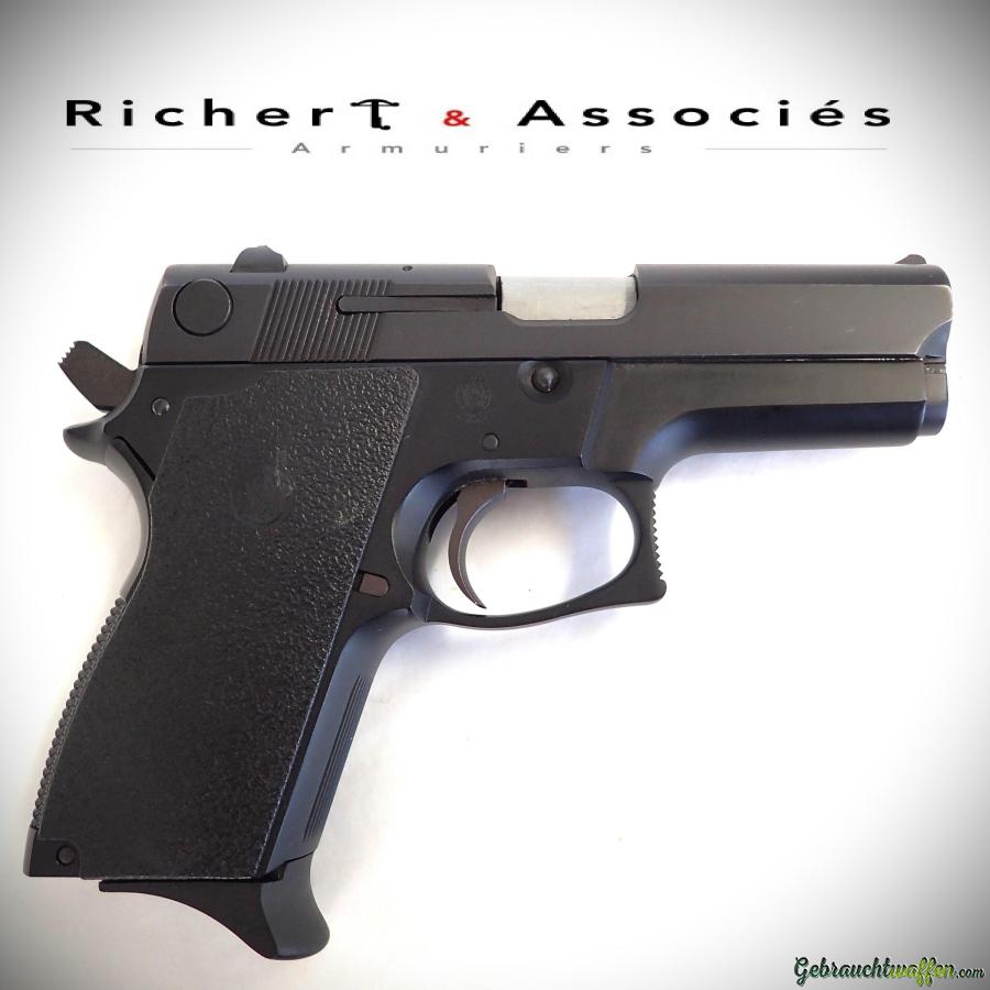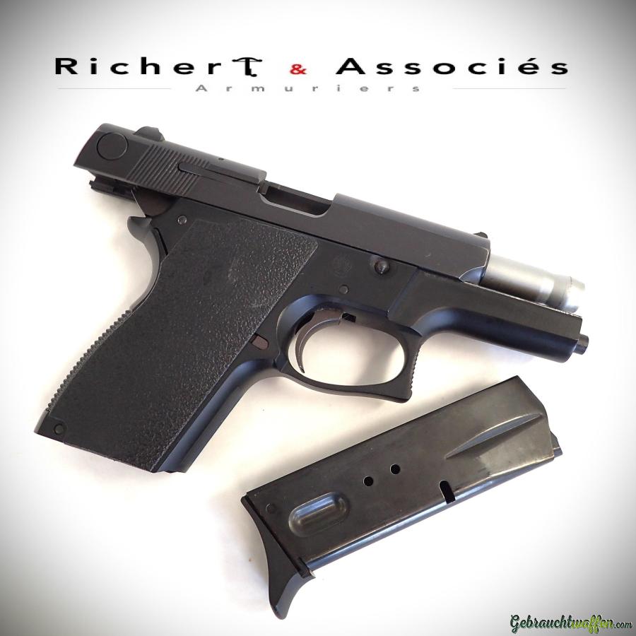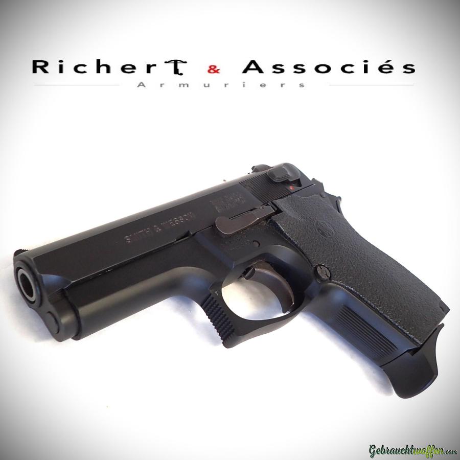 Pistolet compact de 2ème génération Smith & Wesson, mod. 469, cal. 9mmP, canon de 3.5 pouces, chargeur 12 coups, carcasse en alliage léger et culasse en acier, détente DA/SA, marteau type "bobbed", occasion neuve, jamais tiré, livré avec sa boîte, accessoires et 2ème chargeur d'origine.
